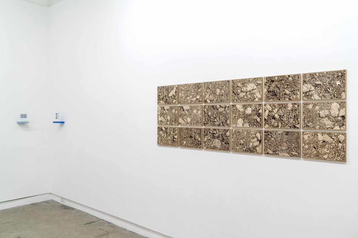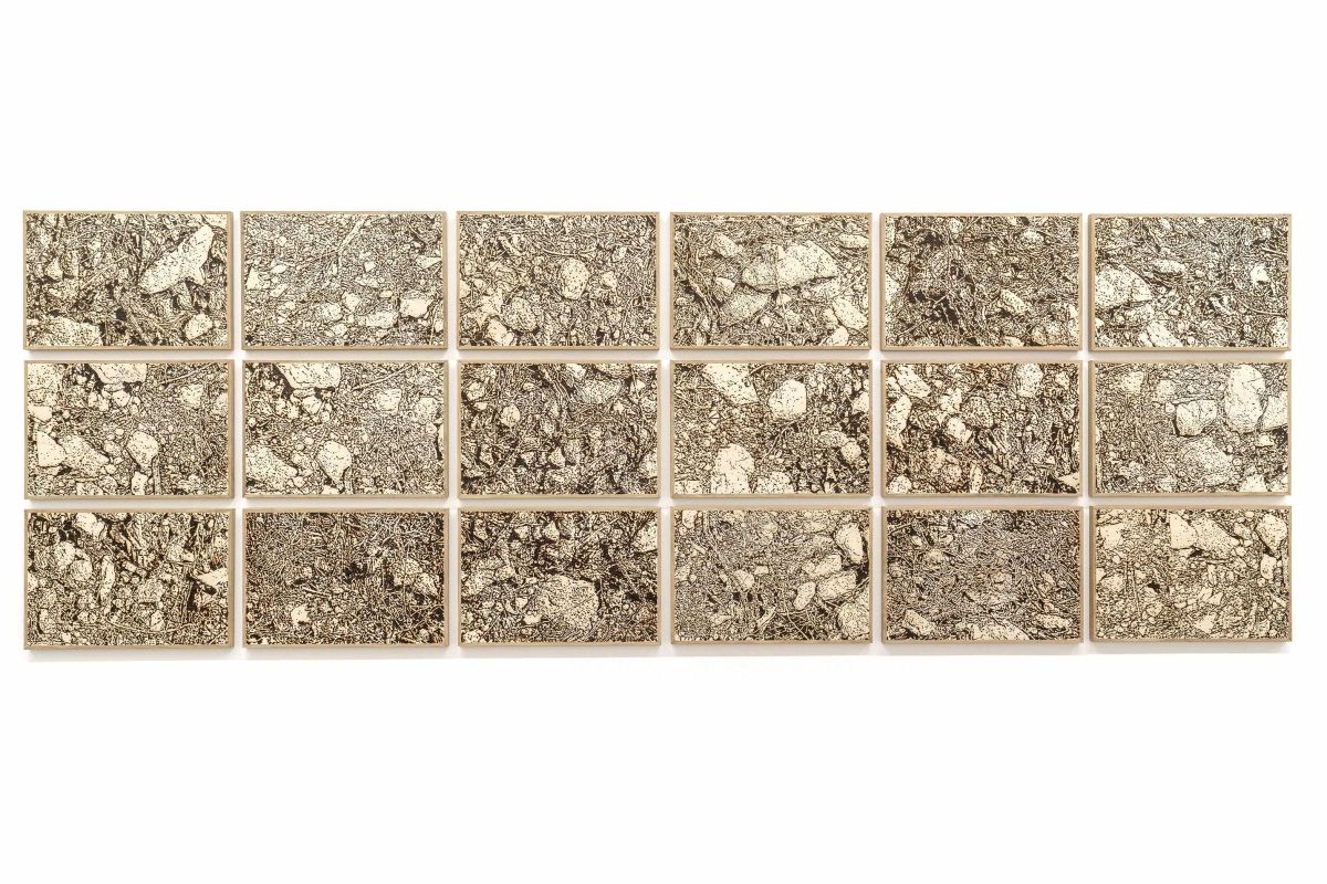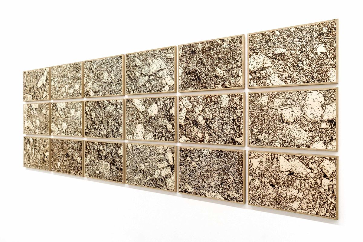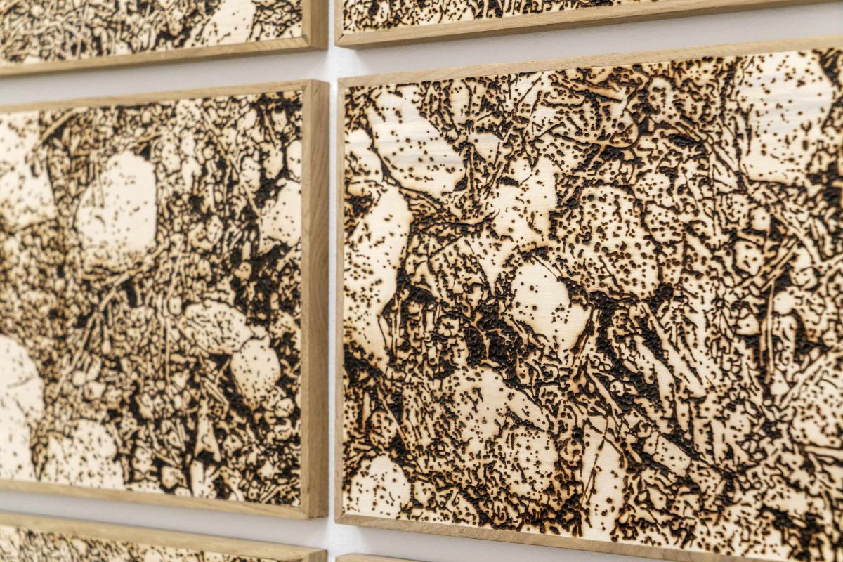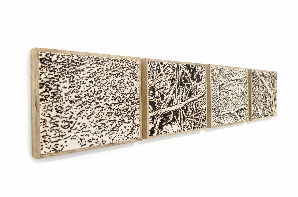 Terres brûlées propose une forme d’archivage de fragments de sol. La technique de la pyrogravure, induit une double lecture de l’image : à distance, elle offre une restitution quasi photographique, fidèle dans sa composition ; à mesure que l’on s’en approche, l’image se décompose en une trame plus abstraite, faite de points, de rythmes graphiques et de formes, révélant alors la technique du brûlage et la trace inscrite dans le bois.