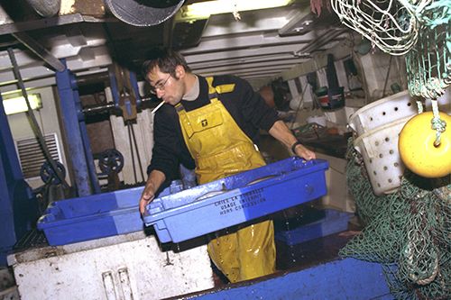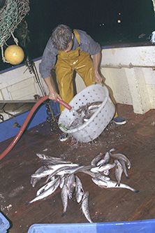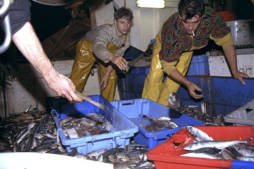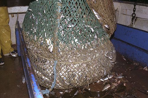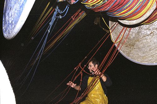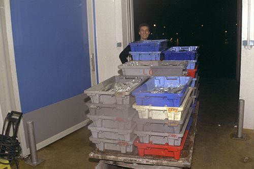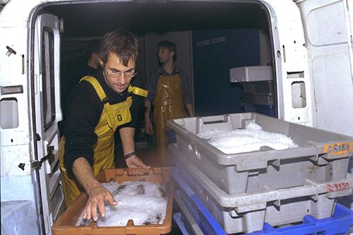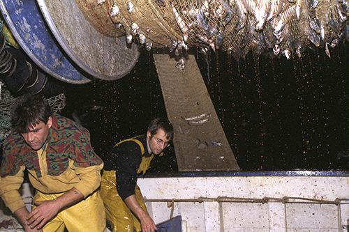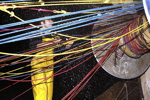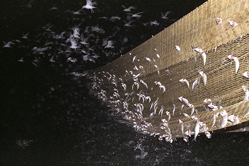 La sortie du port de La Turballe s’effectua vers 18 heures. Une fois au large, vers 20 heures, le filet fut mis à l’eau à la base du “P”. Le patron du bateau et moi n’étions pas sûrs de réussir à écrire ce mot car son tracé impliquait de nombreux virages qui sont difficiles à réaliser lorsque l’on traîne un équipement de pêche de plusieurs tonnes. Le courant et le risque de faire chavirer les panneaux ( plaques métalliques de 300 kg servant à écarter le filet) nous empêchaient de tourner trop rapidement. Pour pouvoir écrire ce mot nous devions aussi trouver une surface suffisamment grande en bon fond (zone de fond mou sans roches et donc sans risque de déchirer le filet) car il était évident que le mot s’étendrait sur plusieurs kilomètres. Le point le plus périlleux que nous dûmes affronter, après deux heures et demie de pêche, fut le point du “i”. Le passage de la base de chaque “s” fut aussi assez délicat. Dans la descente du “O” et pour pouvoir écrire le “N” nous dûmes contourner une zone rocheuse.