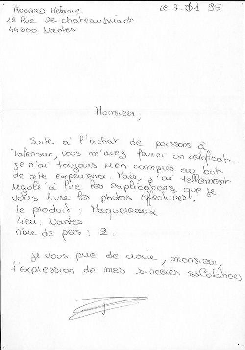 L’écriture de l’ensemble du mot dura 7 heures pour un parcours de 40 kilomètres. Le mot s’étalait sur 7 kilomètres de long par un peu plus d’un kilomètre de large. Le mot produisit 500 kg de poissons (merlans, merluchons, merlus, maquereaux, calamars, lieus jaunes, saint-pierre, mulets, congres…). 150 à 200 kg furent vendus le dimanche 22 octobre 1995 sur le marché de Talensac, à Nantes, où j’avais pu obtenir pour cette occasion une poissonnerie. Le reste du poisson fut vendu à la criée.