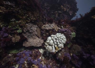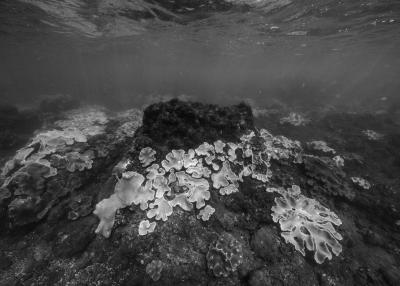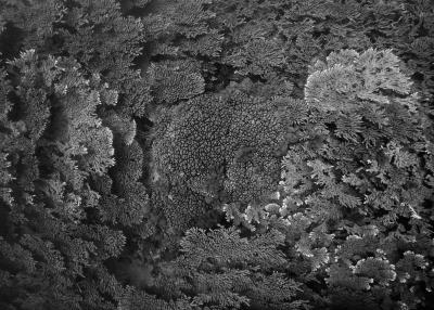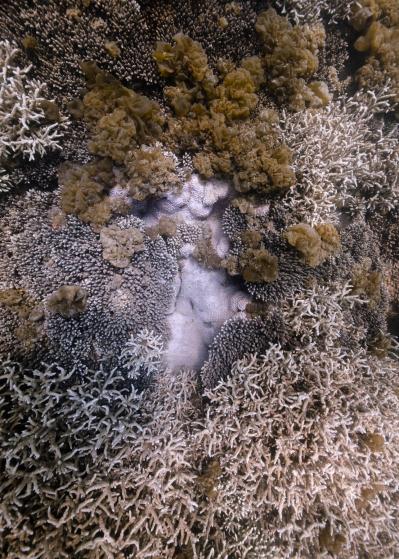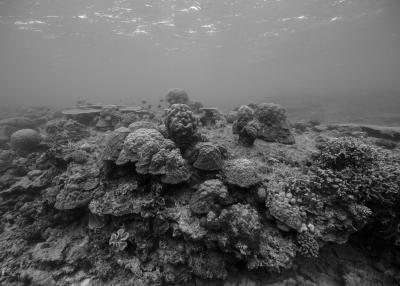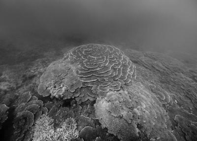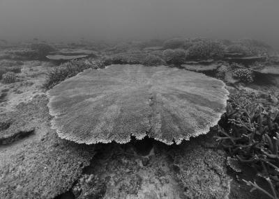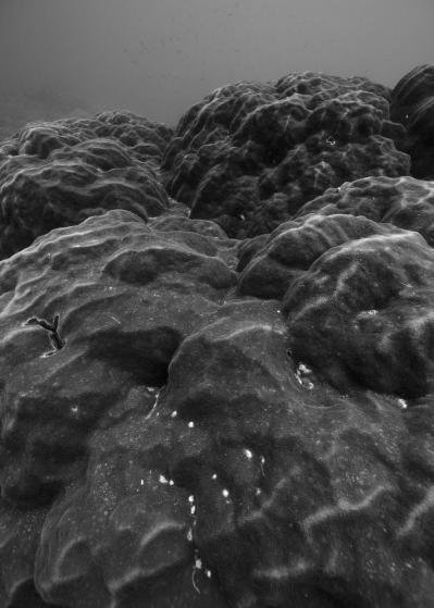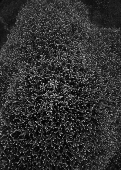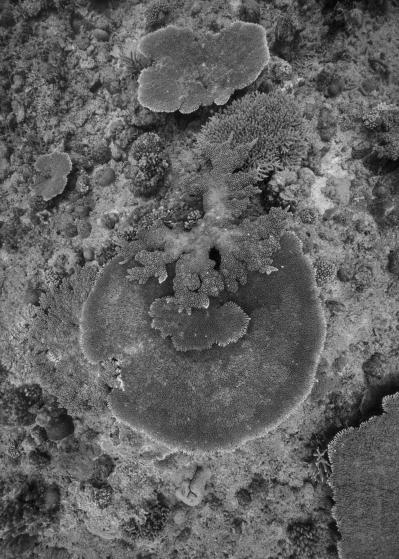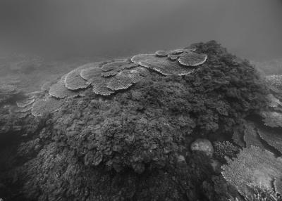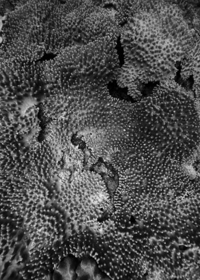 La résidence à bord de la goélette Tara a nourri le travail photographique sur les habitats naturels en le centrant sur les architectures animales que sont les coraux. Ces bio-constructeurs vivent en symbiose avec une algue, la zooxanthelle. Le corail traduit un équilibre entre le règne animal et végétal. Avec le réchauffement climatique, des épisodes de blanchi-ment du corail apparaissent causés par la rupture de la relation symbiotique entre le corail, l’animal, et la zooxanthelle, qui finit par quitter son hôte. Privé de nourriture, le corail blanchit et meurt, pour peu qu’il ne retrouve pas rapide-ment un équilibre avec ses symbiotes.