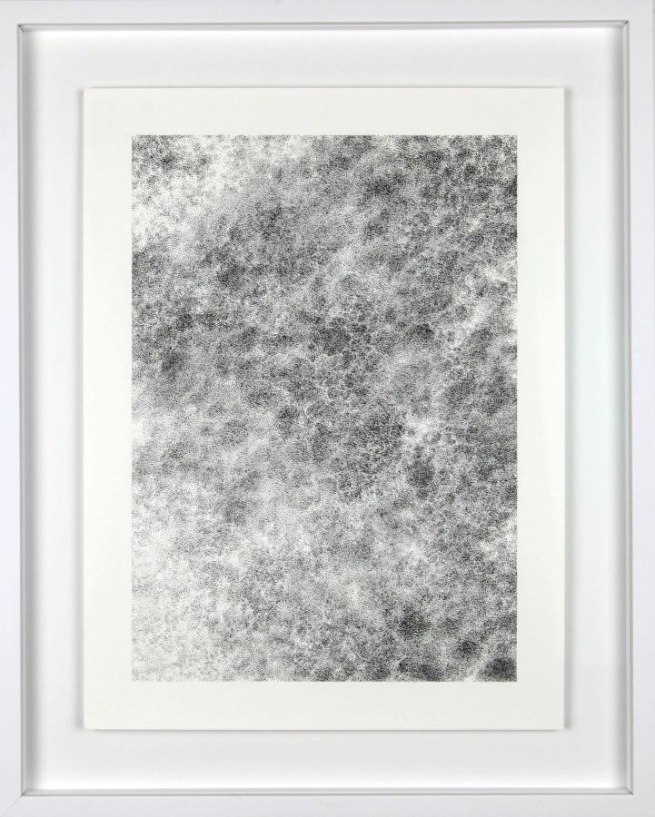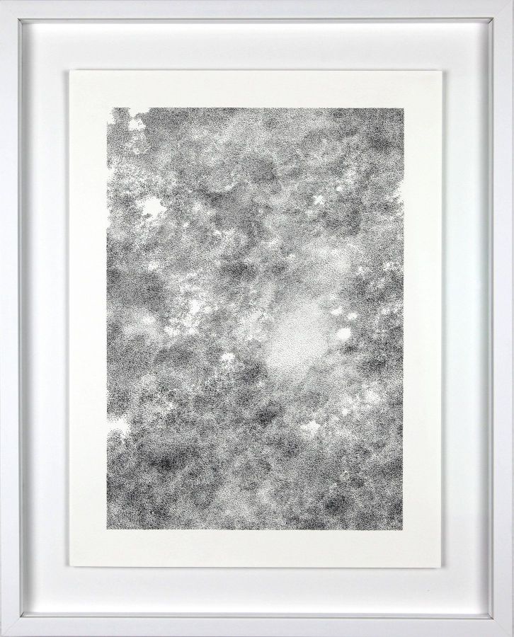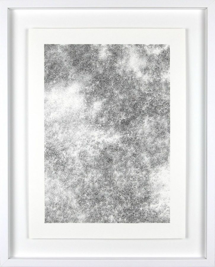 Ces dessins sont constitués d’une multitude de petits points d’encre noire. On peut y voir le geste du tatoueur, mais ces multiples points renvoient avant tout aux différents procédés de reproduction des images, qu’ils soient mécanique (avec l’offset et la sérigraphie) ou numérique (capteurs, logiciels et impression jet d’encre). Ils renvoient aussi à la constitution des nuages, à leur nature-même : des agglomérats de micro-gouttelettes d’eau liées à d’autres particules en suspension dans l’air (issues de l’activité humaine et/ou d’autres vivants comme les cocolithes dans certains milieux océaniques).