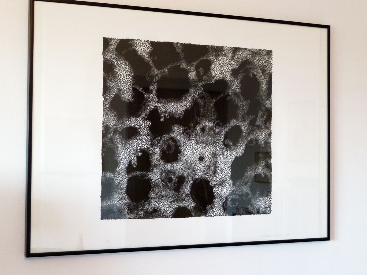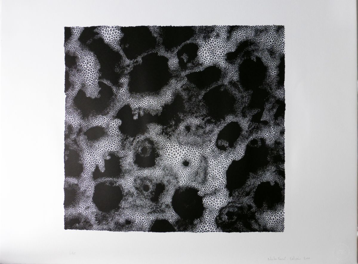 La triangulation appliquée en topograhie et utilisée par les logiciels de construction 3D est ici employée comme un vocabulaire de dessin permettant de créer volume et profondeur à l’image représentée. Celle-ci est une vue microscopique d’un morceau de calcaire. Le calcaire est aussi la pierre utilisée en lithographie, comme celle qui à vue naitre ces tirages.