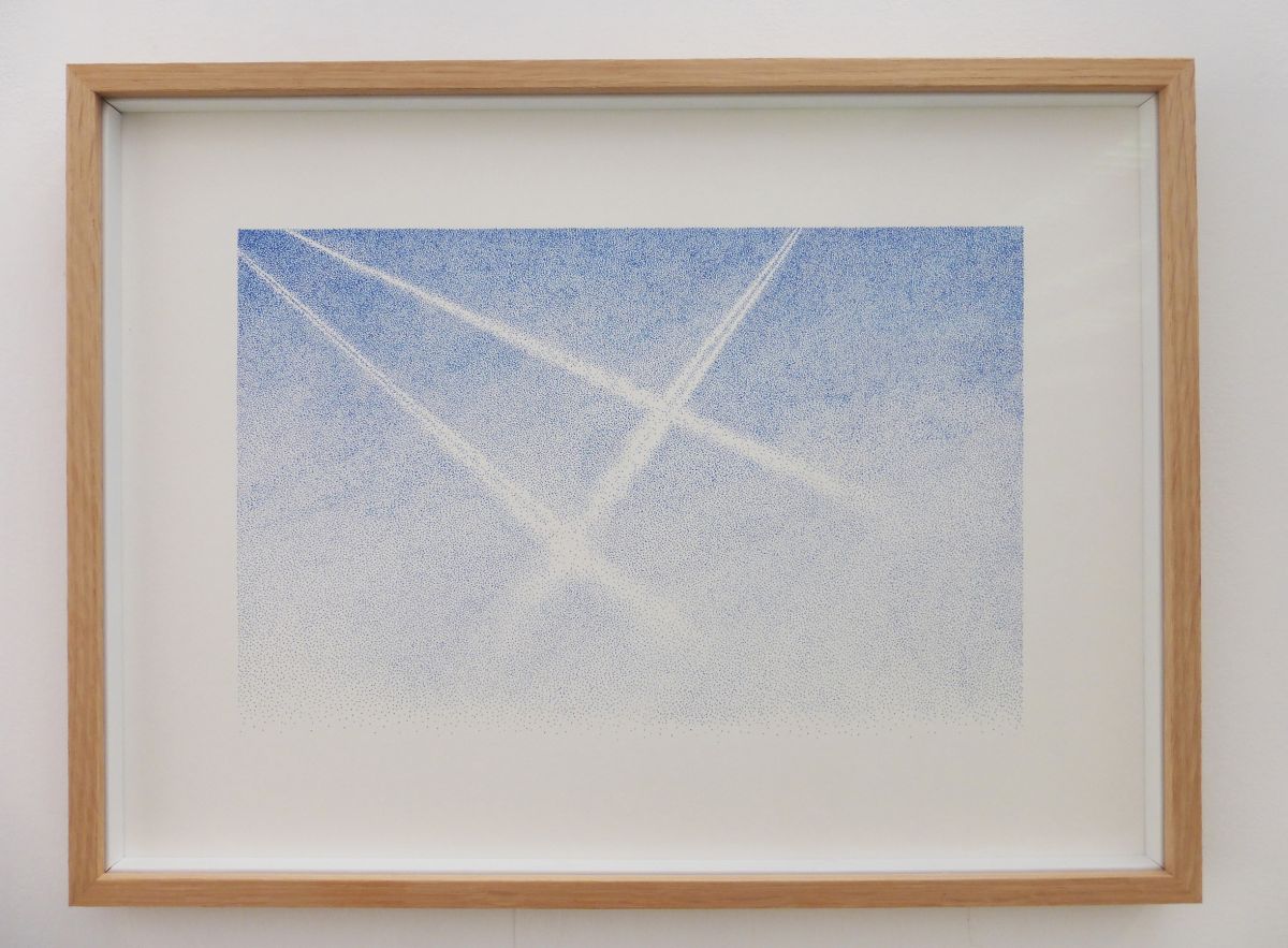 Des éléments graphiques rappelant la représentation cartographique et des multitudes de petits points construisent ces dessins. On peut y voir le geste du tatoueur, mais ces multiples points renvoient avant tout aux différents procédés de reproduction des images, qu’ils soient mécanique (avec l’offset et la sérigraphie) ou numérique (capteurs, logiciels et impression jet d’encre). Ils renvoient aussi à la constitution de l’air, à ses atomes, poussières, corpuscules et planctons aériens qui nous sont en grande partie invisibles et que seuls, par association à des micro-goutellettes d’eau, les nuages nous font voir.