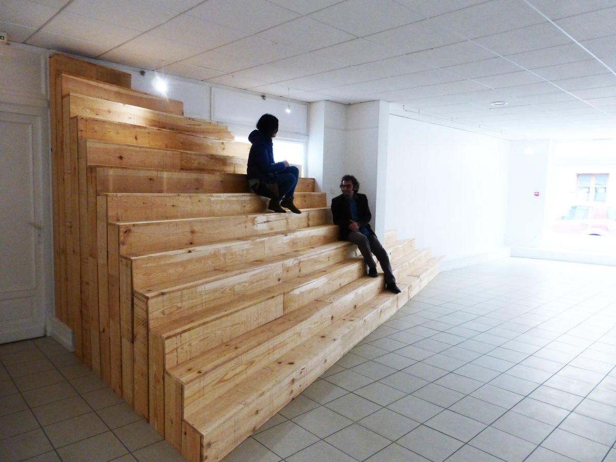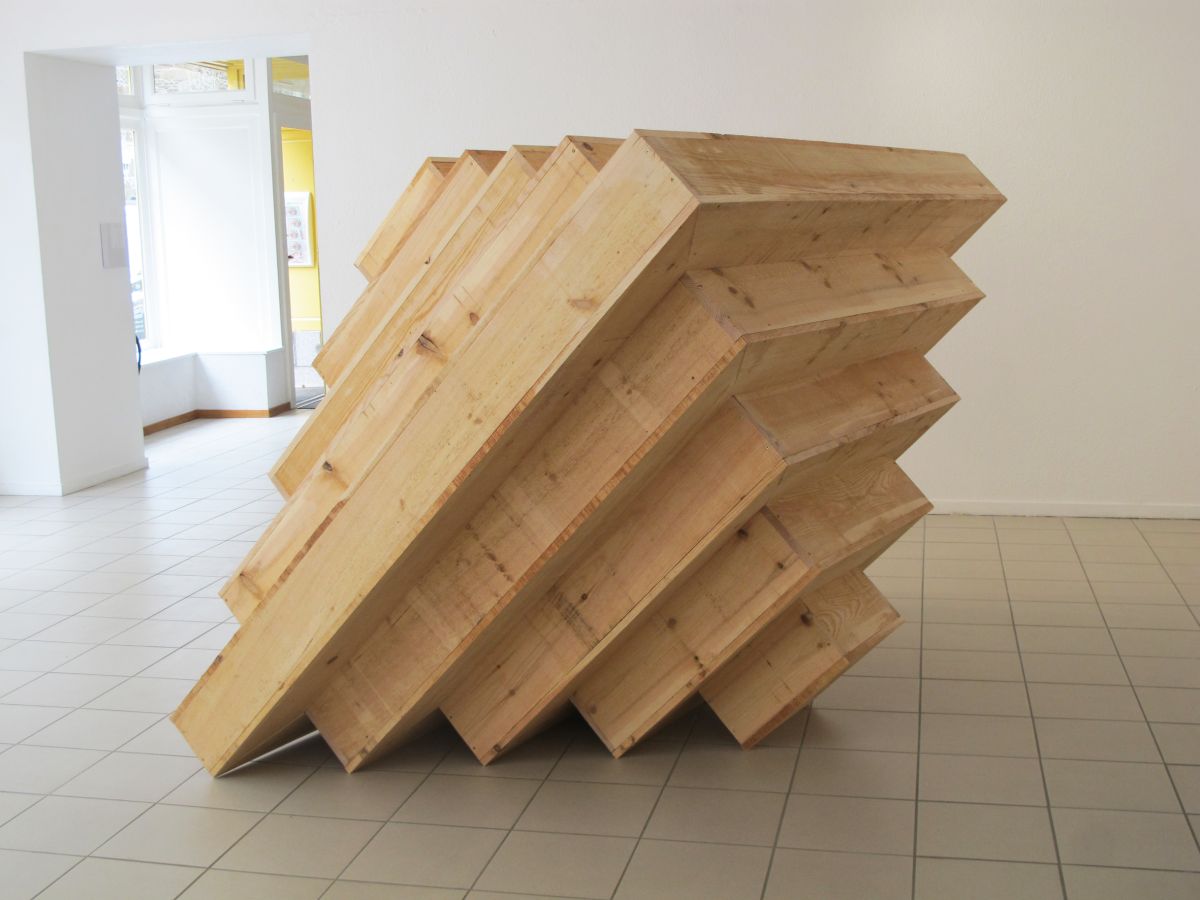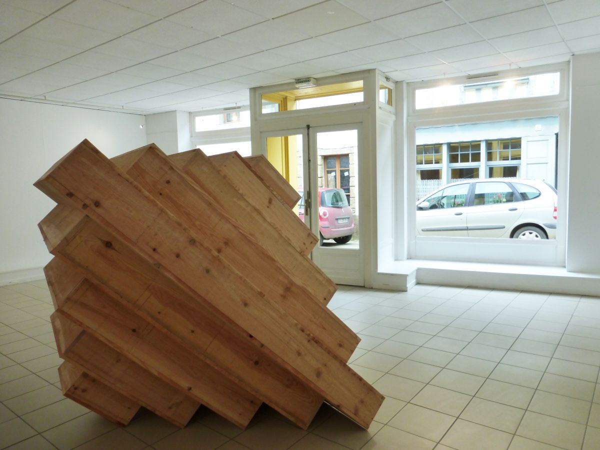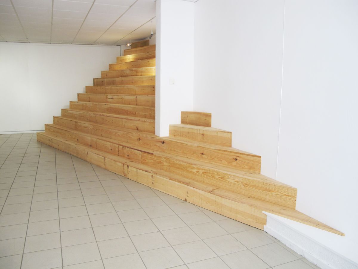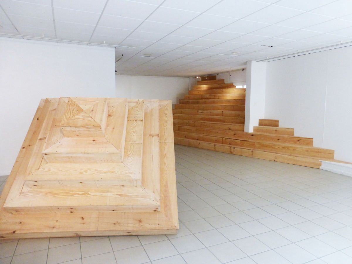 L’origine étymologique latine d’escalier est scala (échelle, qui donne scale en anglais). On peut y voir la dimension proprement fonctionnelle de l’escalier. Le versant en serait le terme d’origine grec : climax, qui évoque davantage la sémantique de la gradation arrivant à un point ultime. Entre fonctionnalité et contemplation, sculpture et élément architectural, il s’agit de faire dialoguer ces oppositions - pratiquer/penser - afin d’entrevoir une complicité implicite mais parfois oubliée. Cette proposition investie l’espace du rez-de-chaussée de la galerie Laizé.
