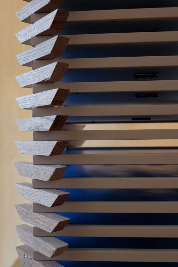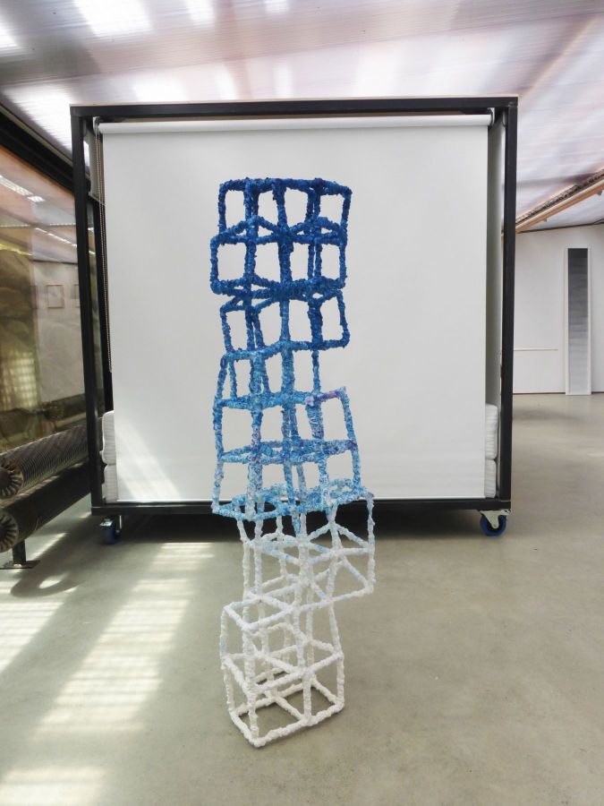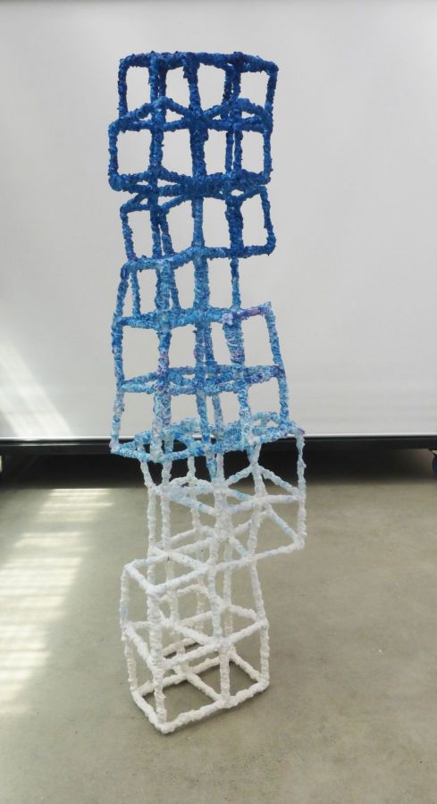 Bois, textile et plâtre, environ 120 x 35 x 35 cm.