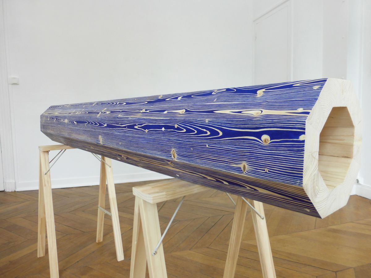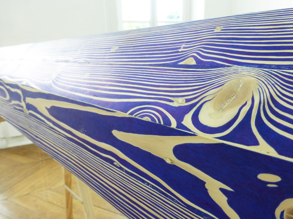 La totalité des surfaces extérieures du bois est travaillée par recouvrement au stylo bille bleu. De façon précise et méticuleuse, les linéaments bleus des stylos suivent le dessin des fils du bois.