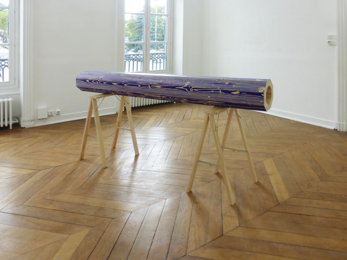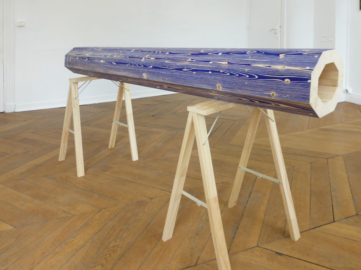 La sculpture Fontaine est composée d’un octogone en bois d’environ deux mètres de longueur pour un diamètre de vingt cinq centimètres posé sur des tréteaux adaptés.