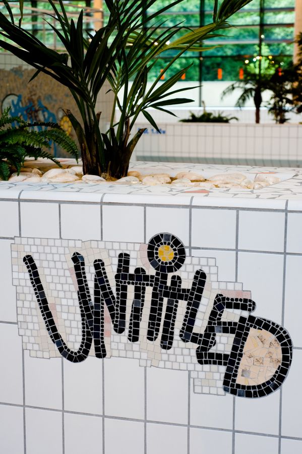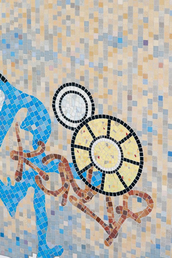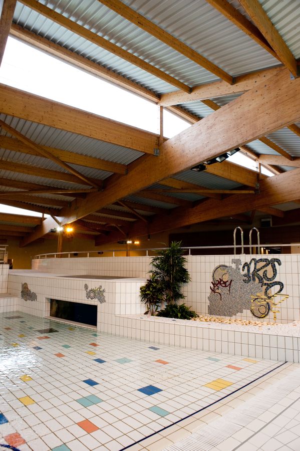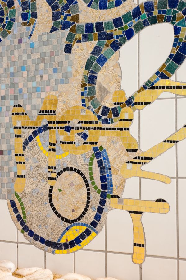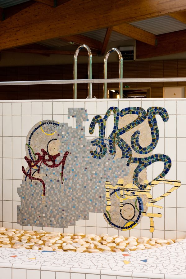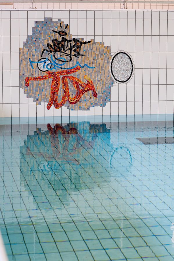Dans la nouvelle piscine des Gayeulles, l’œuvre de Nikolas Fouré UNTITLED consiste en plusieurs fragments de mosaïques disséminés dans la vaste salle des bassins.