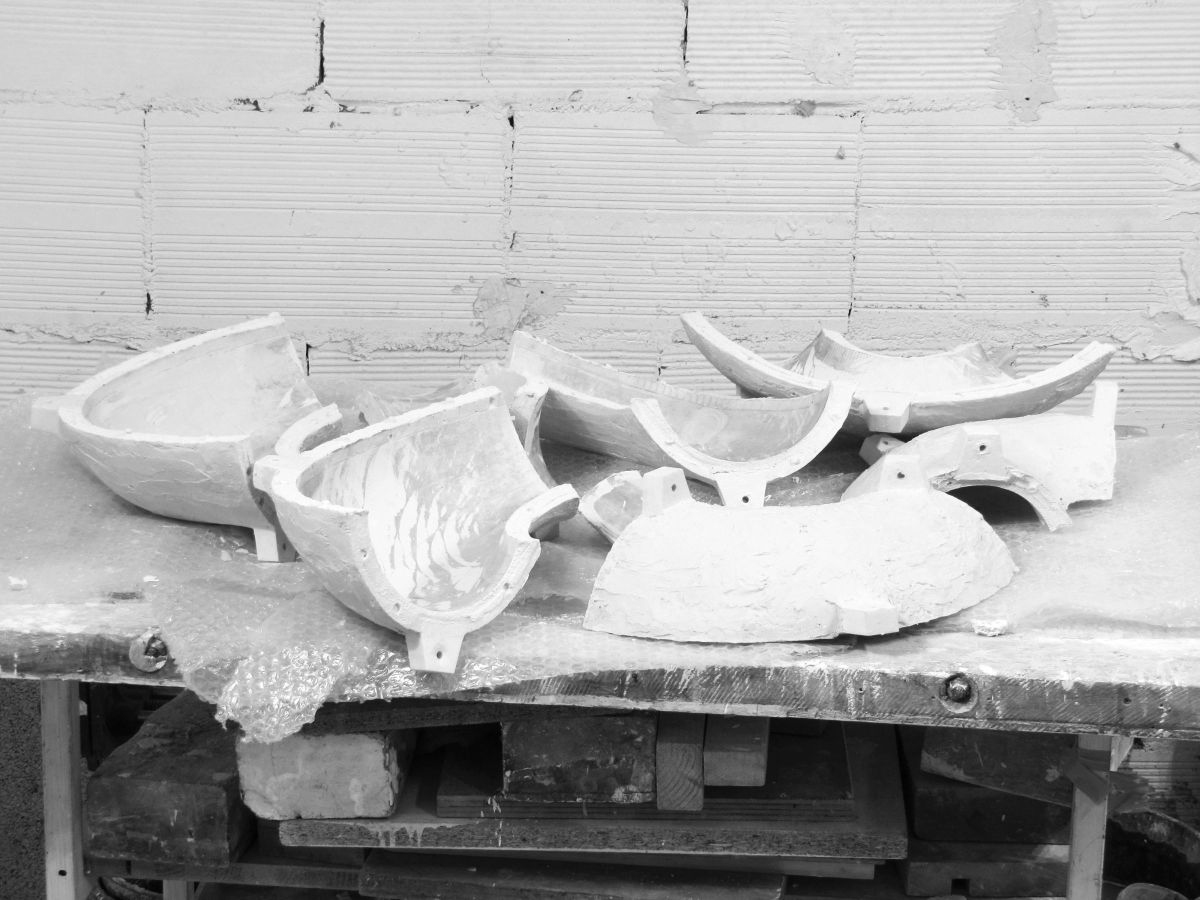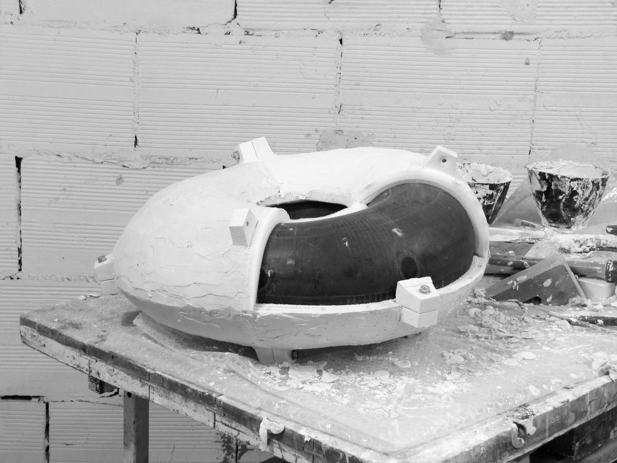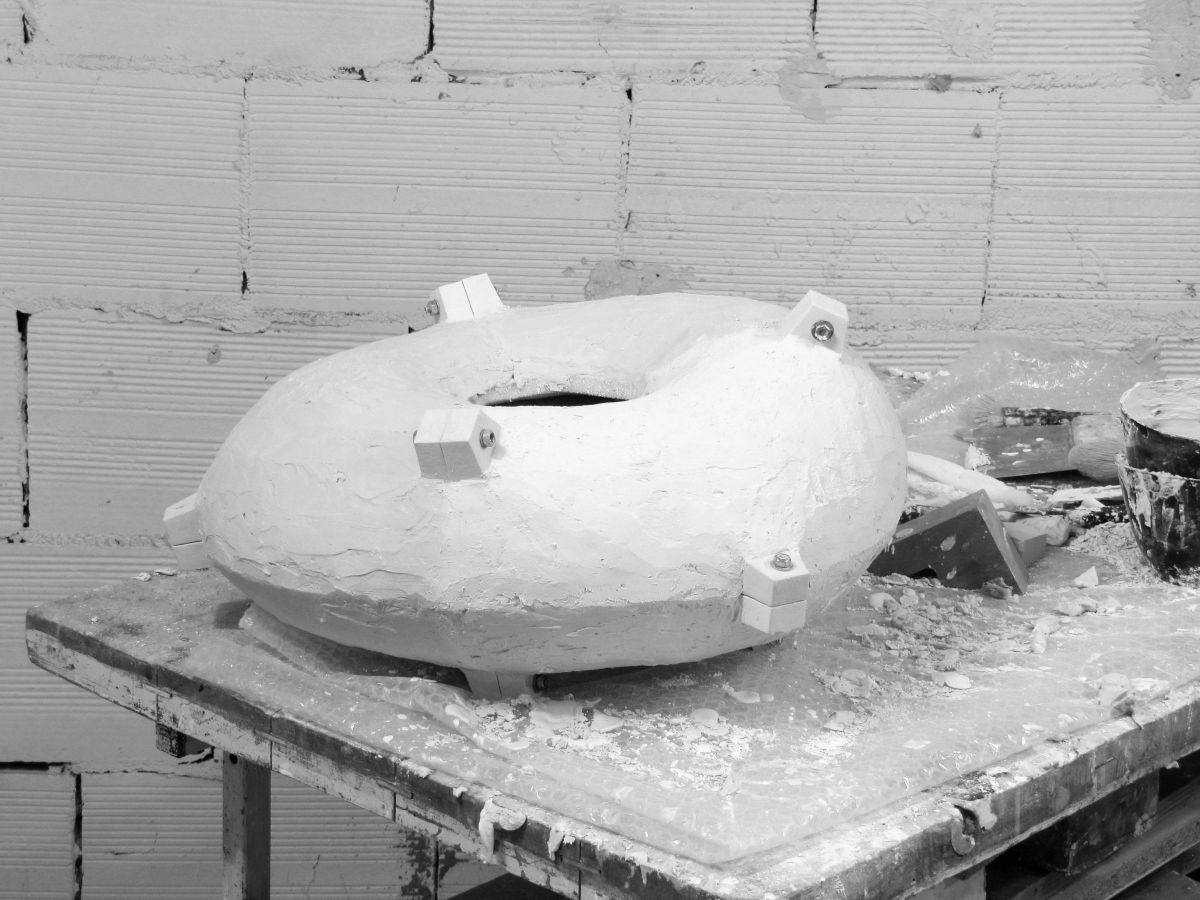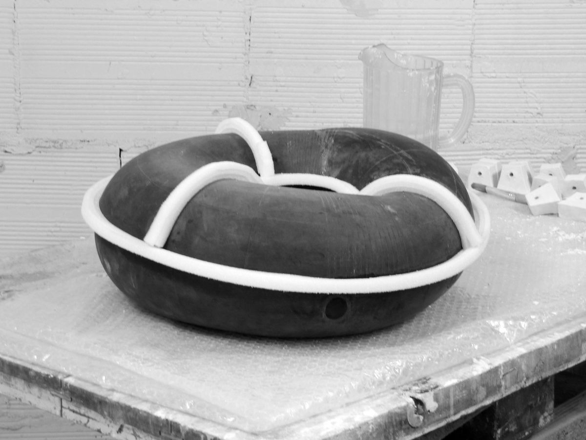 Le travail tire parfois profit de la technique dite de « moule à bon creux » qui permet d’obtenir plusieurs épreuves à partir d’une matrice de plâtre ; celle-ci est constituée de plusieurs pièces – dont le nombre dépend de la forme à reproduire – et d’un dispositif qui tour à tour les maintient jointes et permet de les séparer. Pascal Jounier Trémelo fait de ce type de moule un objet sculptural en utilisant ses éléments fonctionnels comme fondements d’une invention de formes. Inventer, dans ce cas, c’est fabriquer dans « les règles de l’art » en y opérant un léger déplacement. Ainsi, les 64 pièces de plâtre maintenues par des tiges filetées et des boulons découlent des opérations techniques permettant de construire le moule d’une chambre à air Kleber 20,8+620/70+710/60-42TR218 ; mais le soin apporté à leur réalisation excède la logique fonctionnelle. La régularité des surfaces de plâtre, la géométrisation des renflements supportant tiges et boulons font du moule une forme ambivalente : elle laisse percevoir les procédures et l’élément dont elle provient tout en établissant une connexion entre un souple objet gonflé d’air et un anneau tronqué, hérissé de parallélépipèdes aux angles vifs.