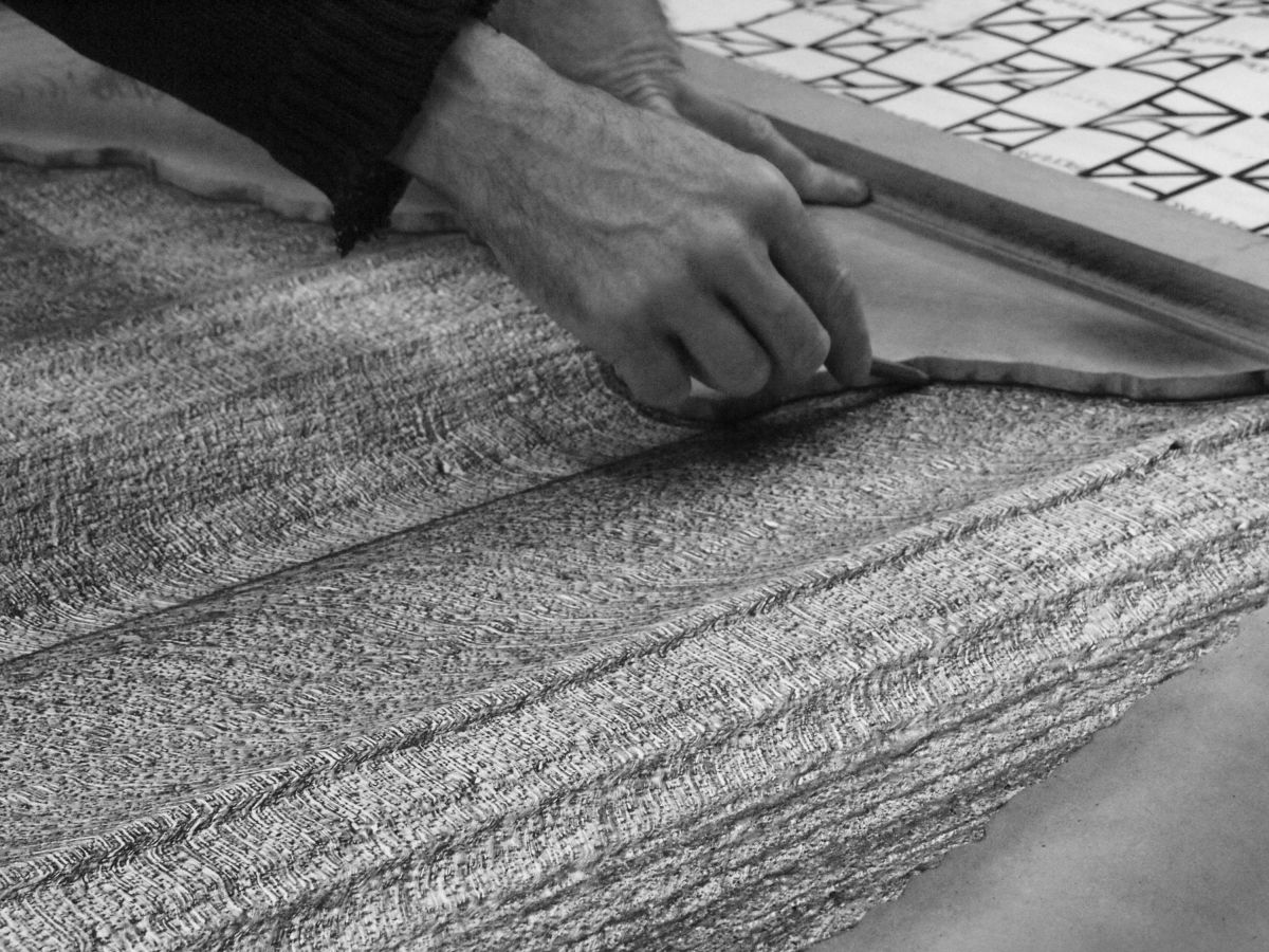À partir de signes et d’objets familiers, il explore des mouvements de transformation et des changements d’état de la matière en laissant une place au hasard et à l’accident. Ainsi, un simple bout d’étoffe devient un éperon rocheux, la ligne dessinée par une fissure devient un paysage ou une architecture.