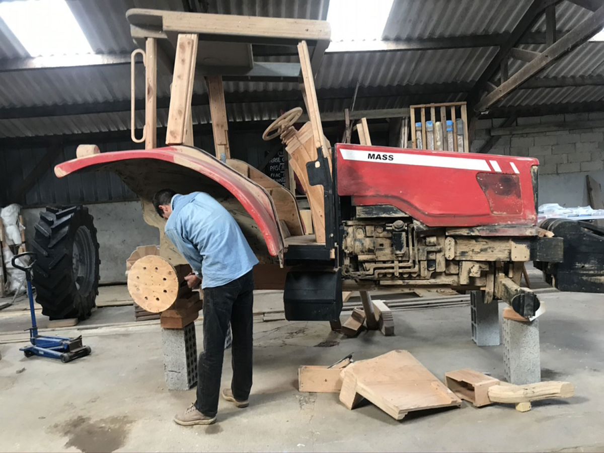 Voiture Darty, mobylettes de livreurs de pizza, fourgon Brink’s, moissonneuse-batteuse ou tracteur… Autant de véhicules utilitaires, construits à l’échelle 1 en bois peint aux couleurs des originaux, qui interrogent obstinément le geste de reproduction.
