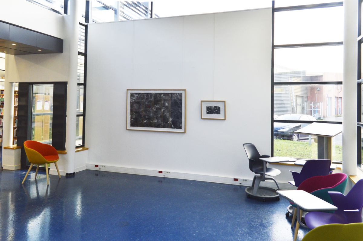 Vue de l'exposition Omphalos, Bibliothèque Universitaire du Mont Houy, Université Polytechnique Hauts-de-France, Valenciennes, 2019