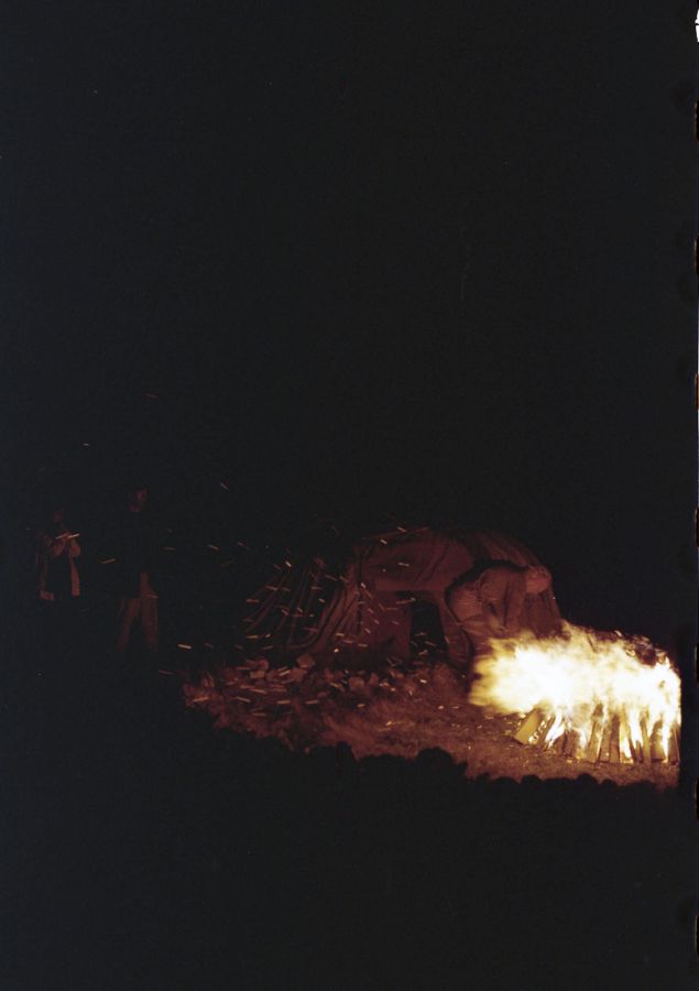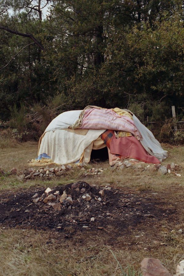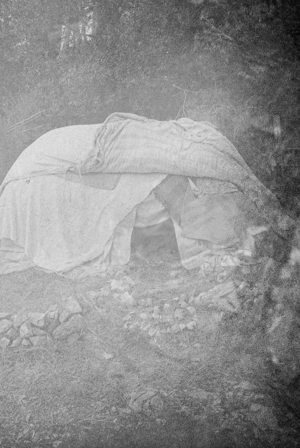 Ce travail à pour sujet la hutte à sudation, construction précaire de bois, de toile et de peaux animales qui, chauffée par des pierres chaudes devient l’espace d’une reconnexion et d’une purification du corps et de l’esprit.