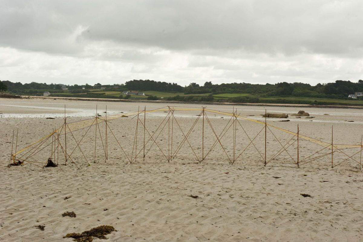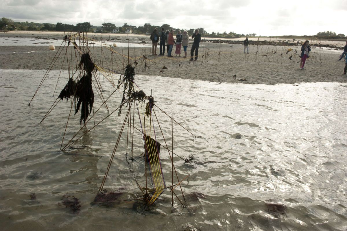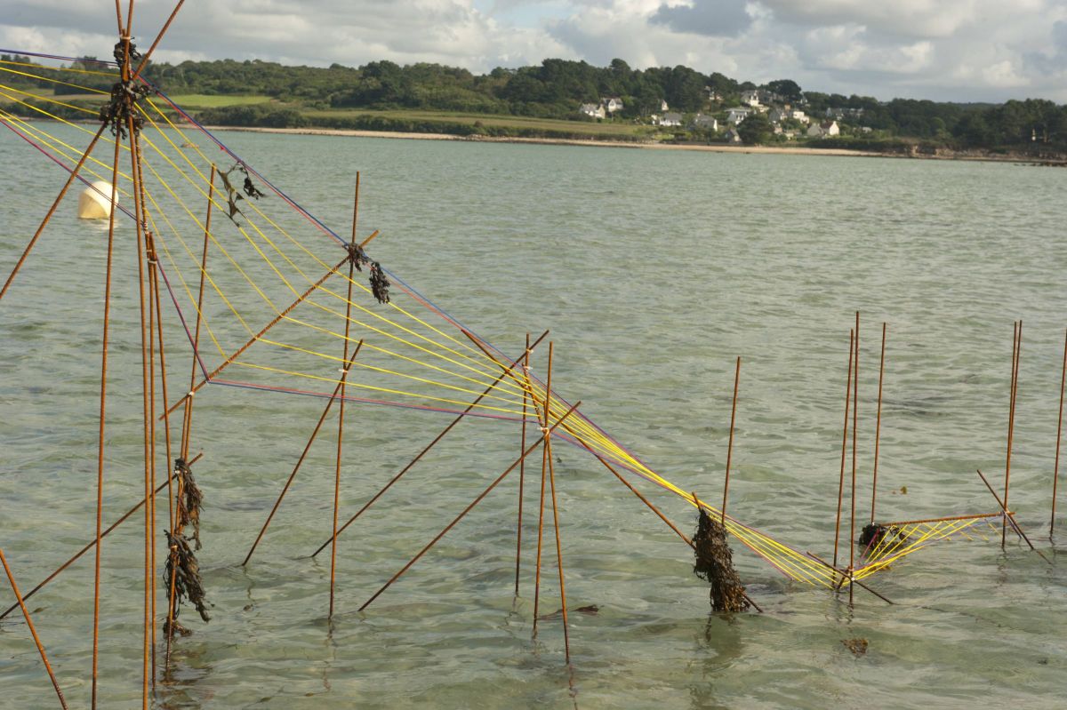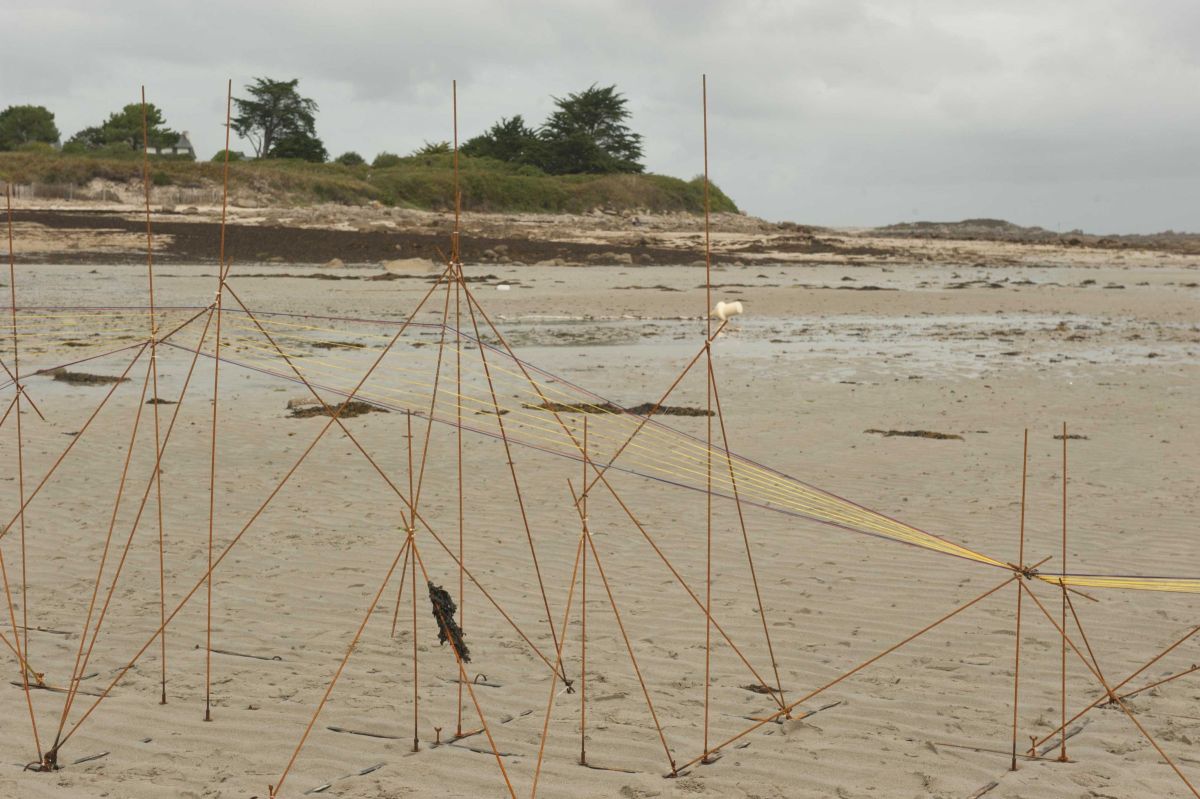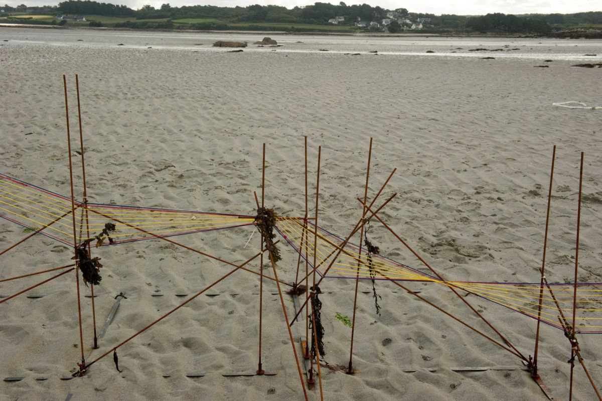Oeuvre changeante et évoluant au gré des marées, elle est composée d’une fine structure de métal ondulante, ancrée dans le sol, soutenant une membrane de fils de pêche, jaune, rouge et bleu. À chaque marée, elle est submergée, les algues sont alors prises au piège et deviennent intégrées à la sculpture.