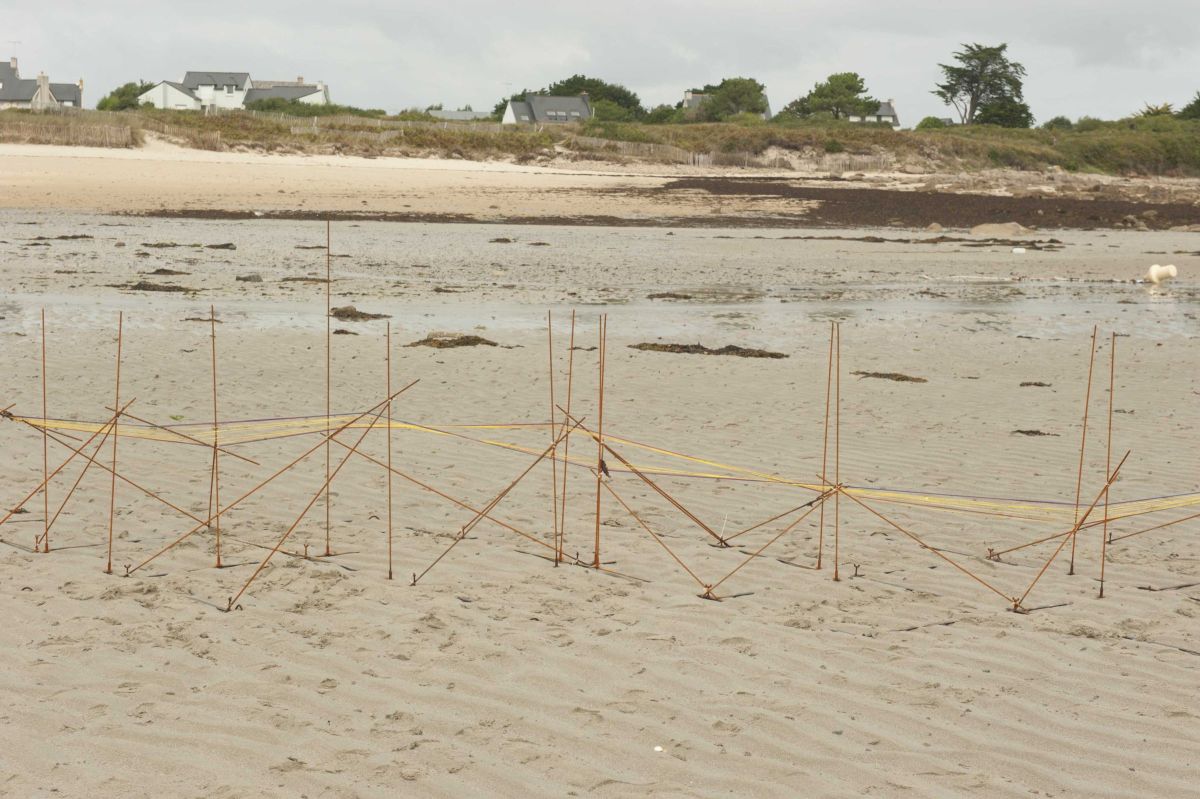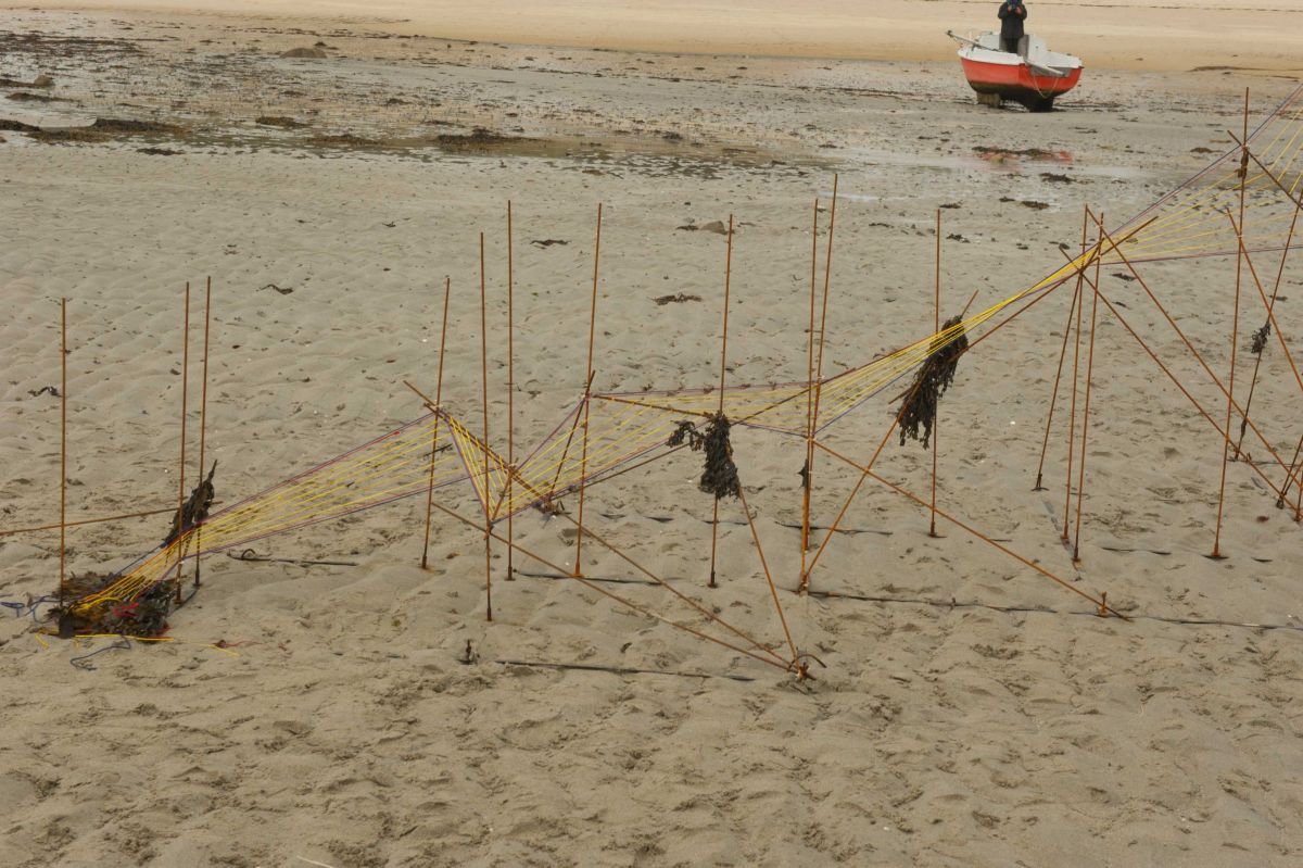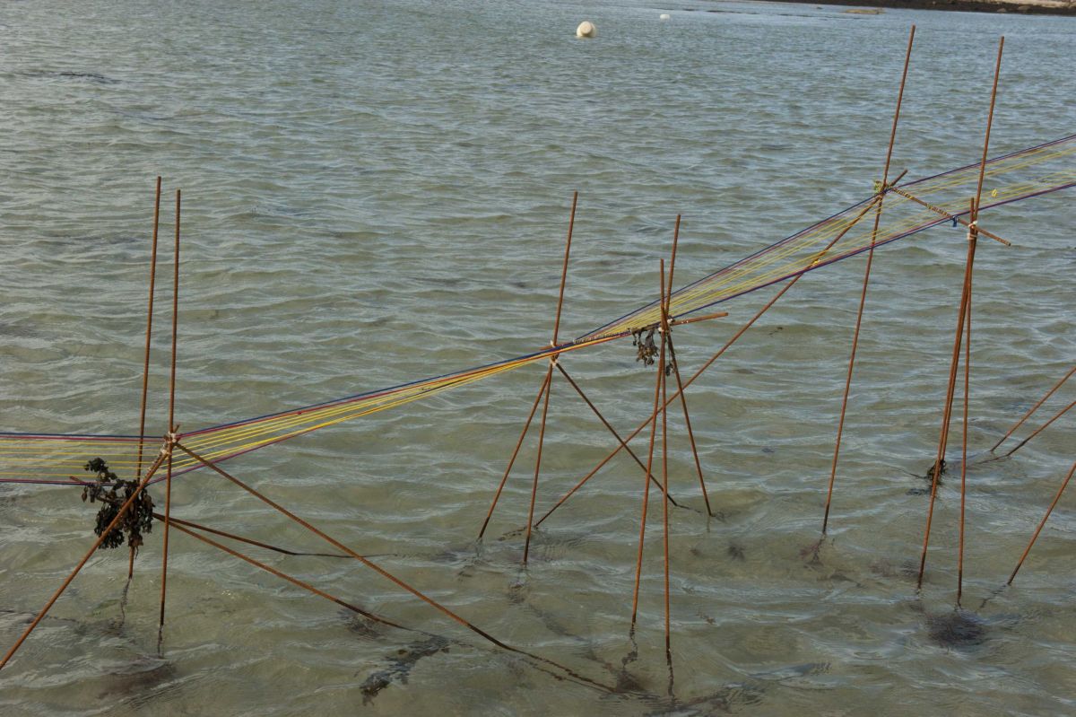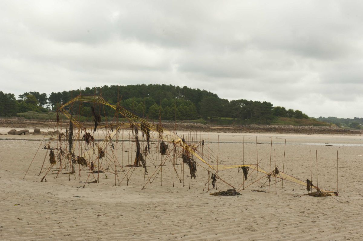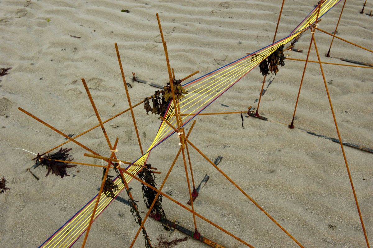 Oeuvre changeante et évoluant au gré des marées, elle est composée d’une fine structure de métal ondulante, ancrée dans le sol, soutenant une membrane de fils de pêche, jaune, rouge et bleu. À chaque marée, elle est submergée, les algues sont alors prises au piège et deviennent intégrées à la sculpture.