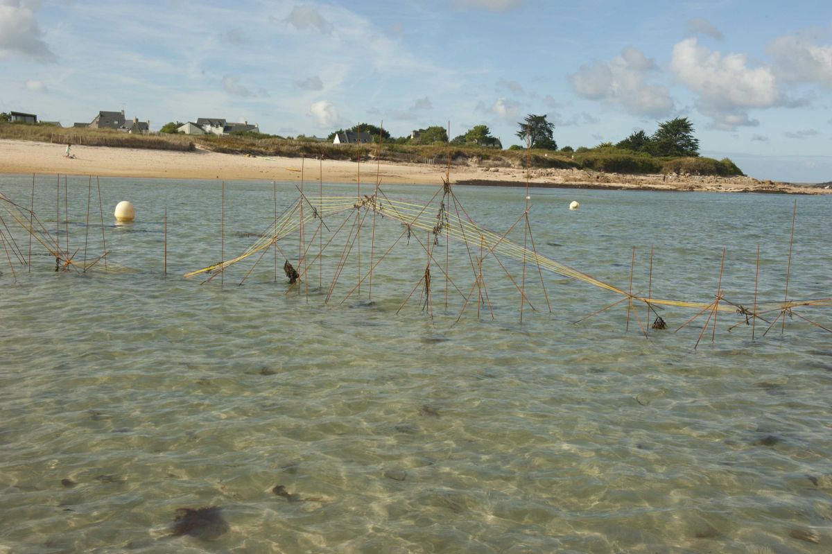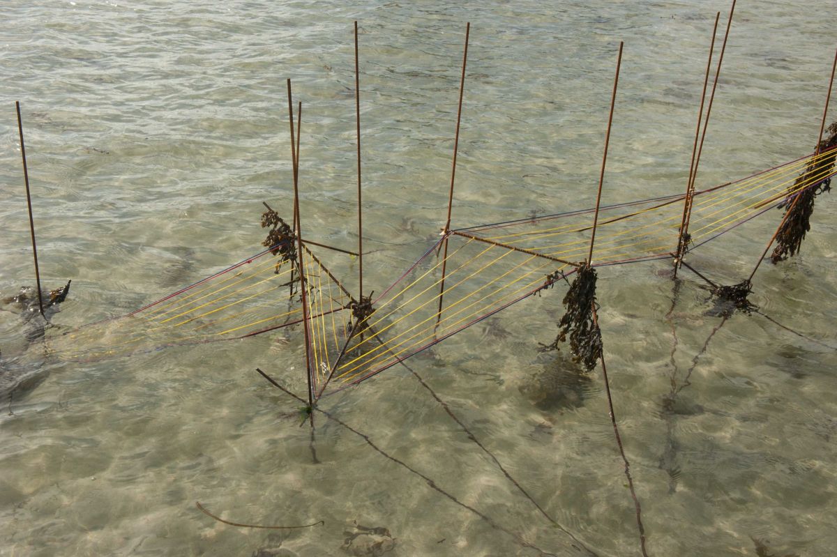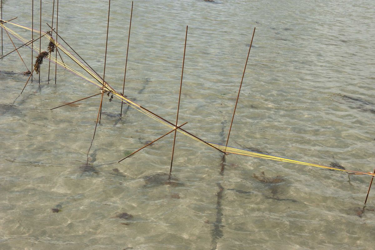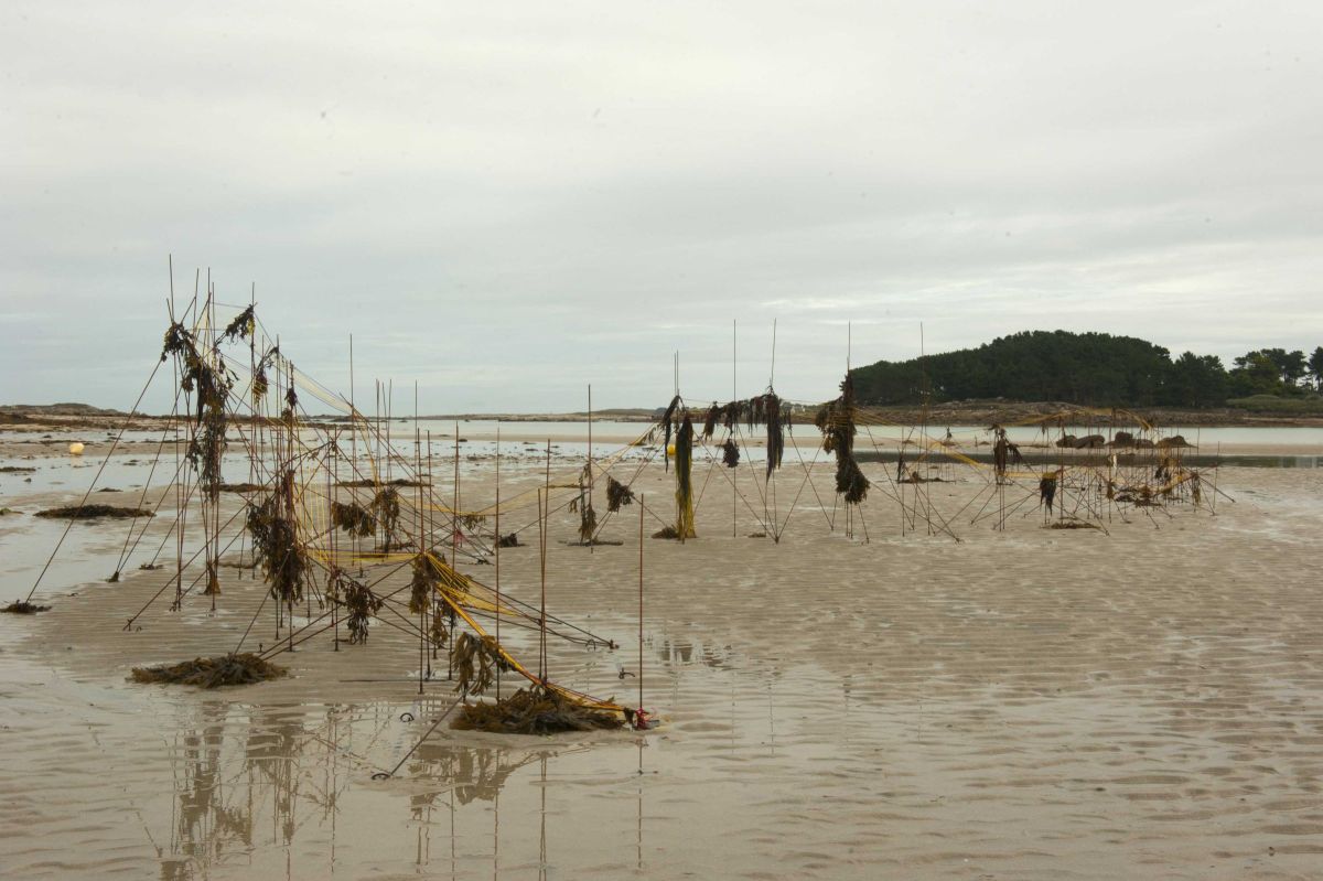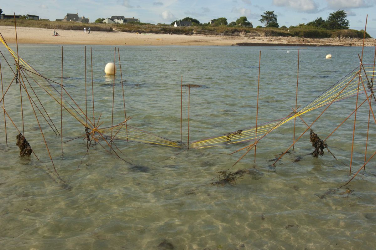 Oeuvre changeante et évoluant au gré des marées, elle est composée d’une fine structure de métal ondulante, ancrée dans le sol, soutenant une membrane de fils de pêche, jaune, rouge et bleu. À chaque marée, elle est submergée, les algues sont alors prises au piège et deviennent intégrées à la sculpture.