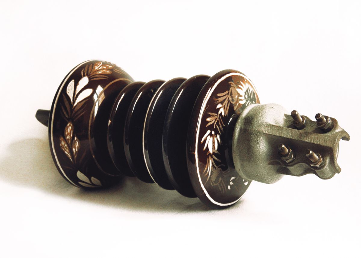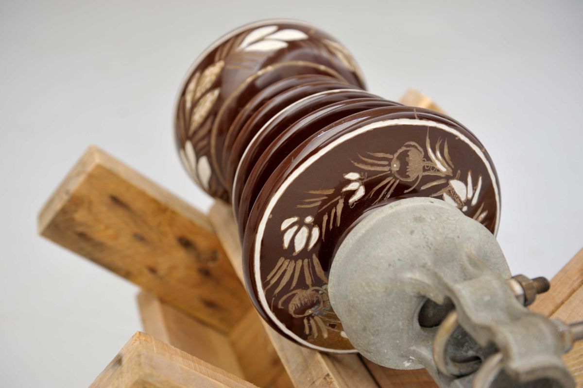 Gravure de motifs de faïencerie de Quimper sur isolateur électrique, 45 x 25 x 25 cm