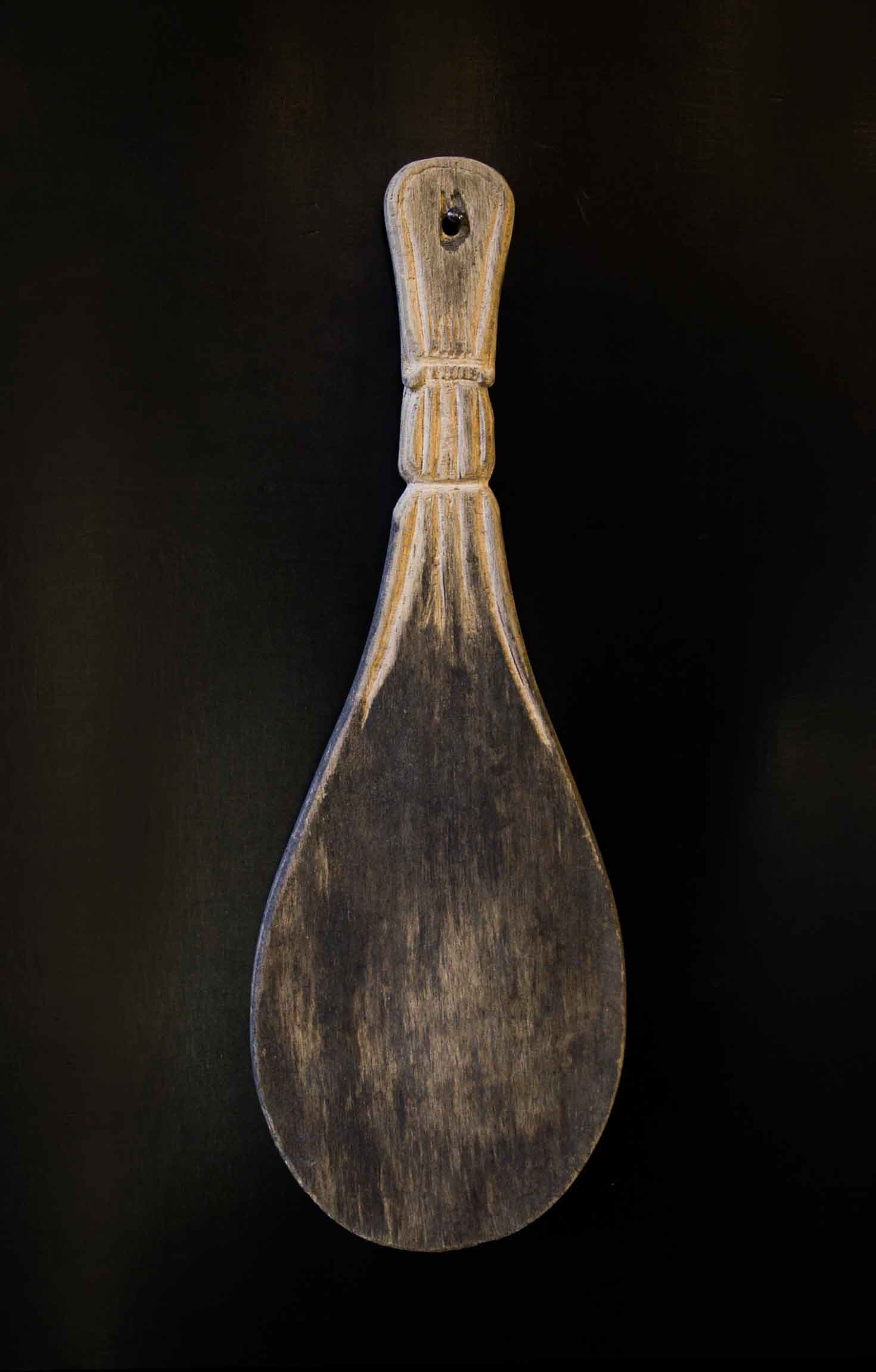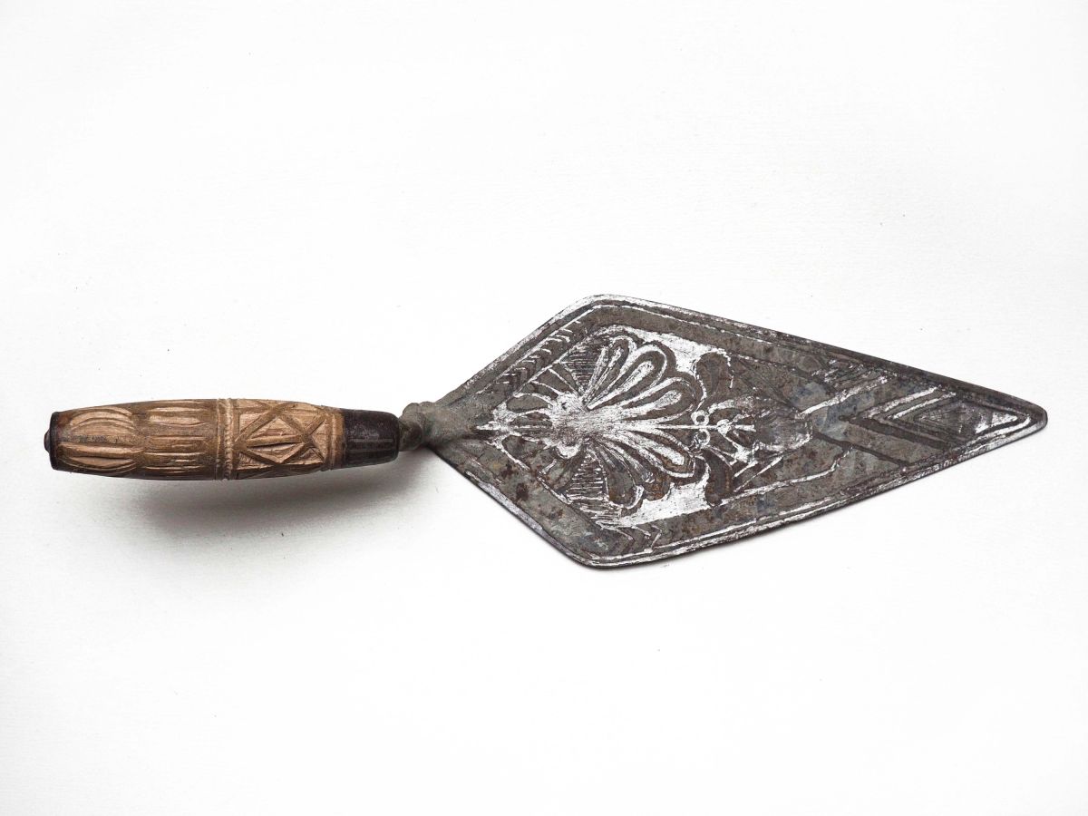 Gravure de motifs sur truelle cimentée en métal et bois, 35 x 15 x 15 cm