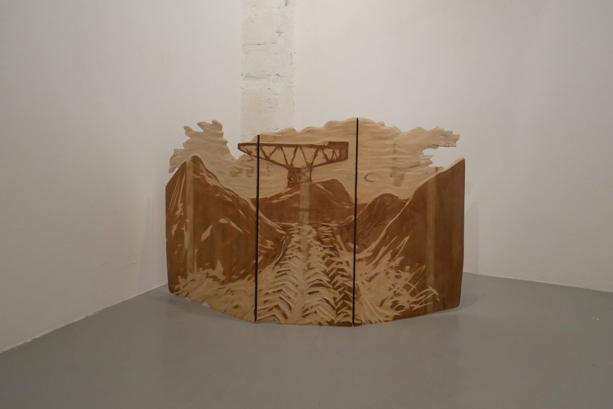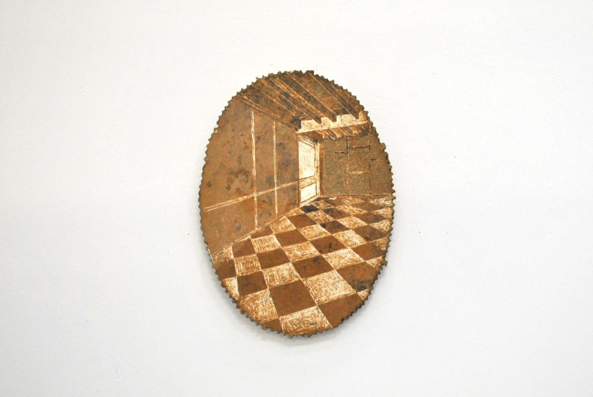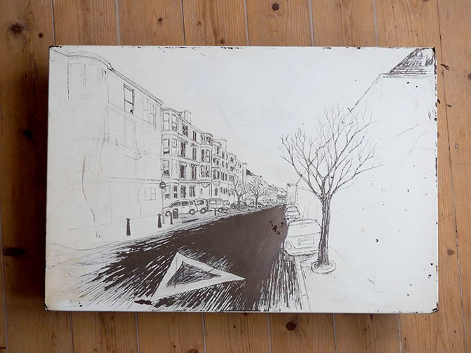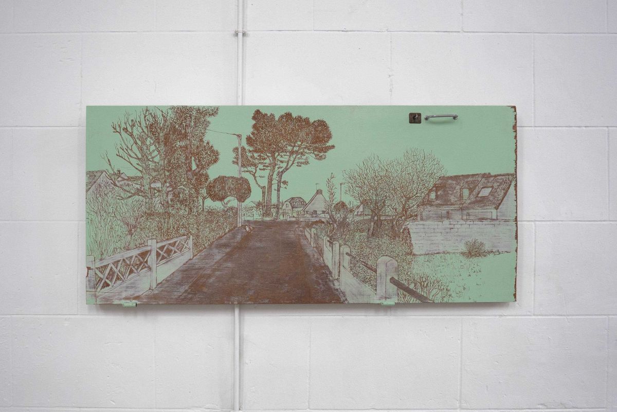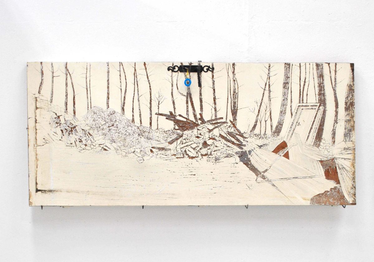 Série de dessins gravés sur des matériaux glanés. La gravure représente l'endroit où l'objet a été récupéré (lieux en transition).