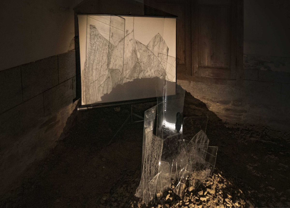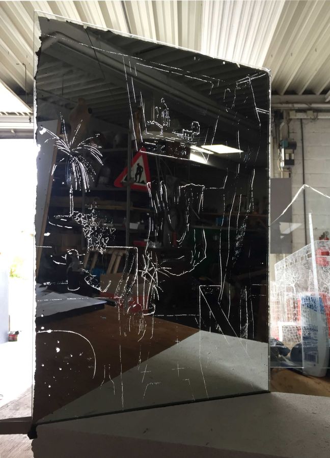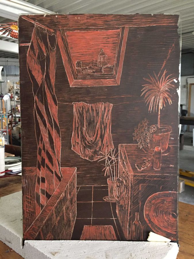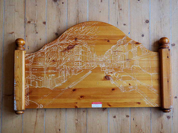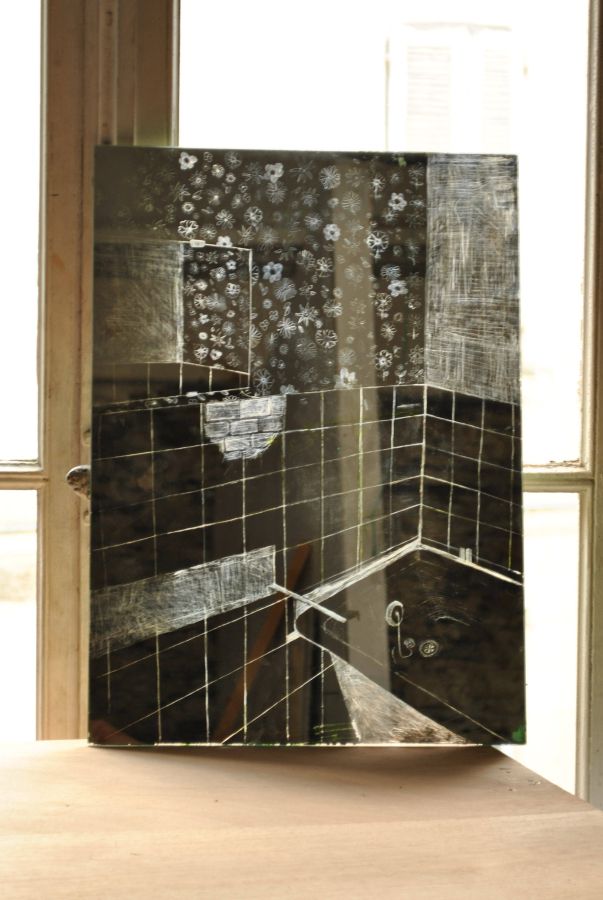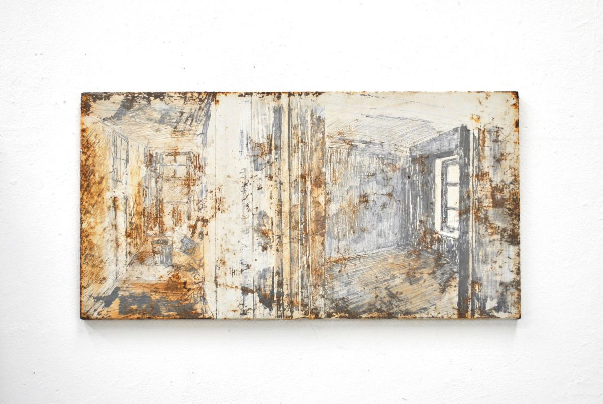Série de dessins gravés sur des matériaux glanés. La gravure représente l'endroit où l'objet a été récupéré (lieux en transition).
