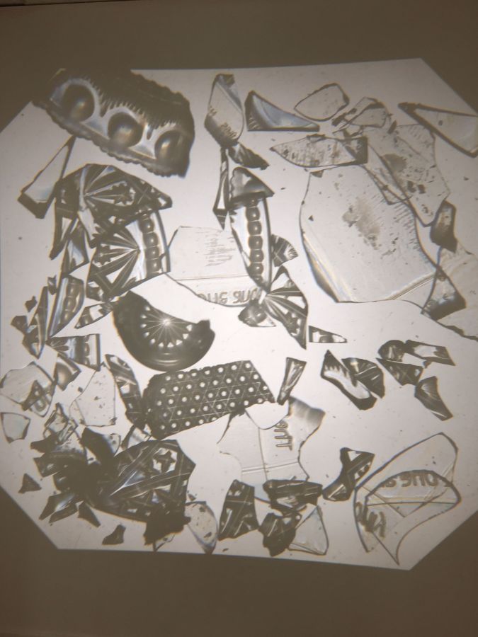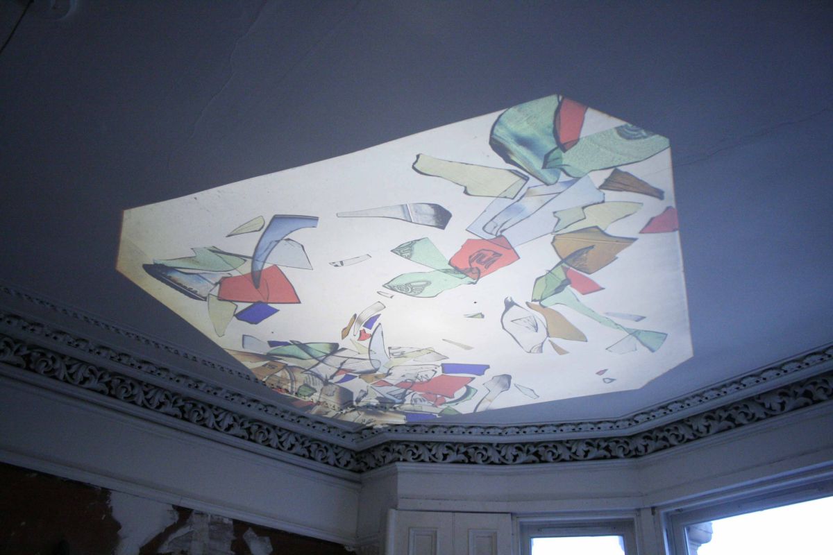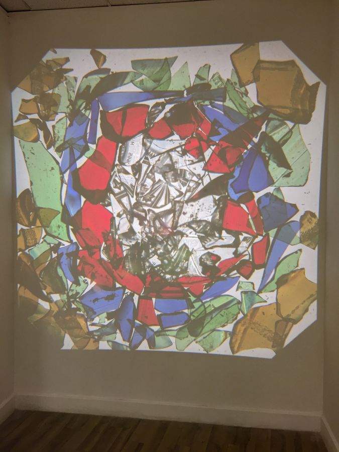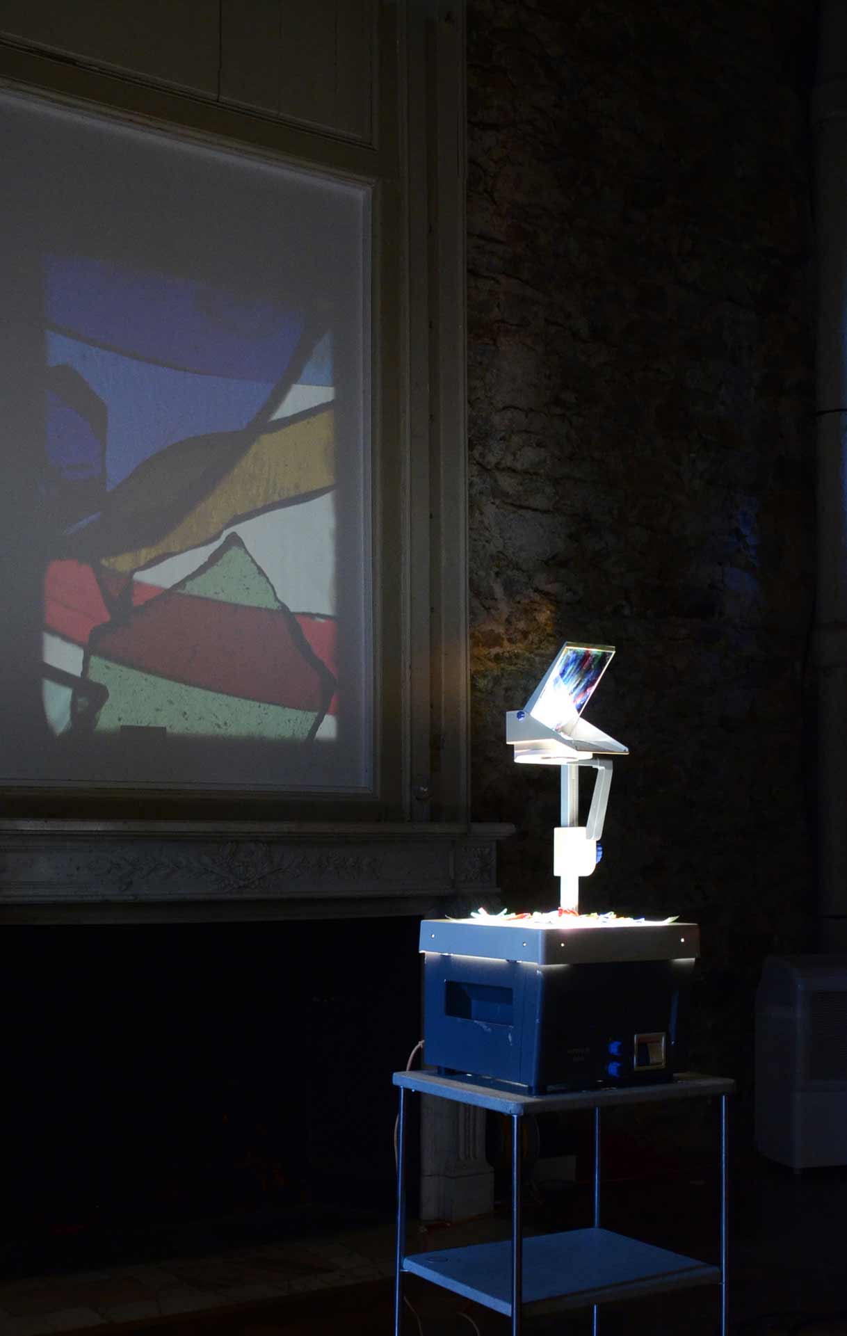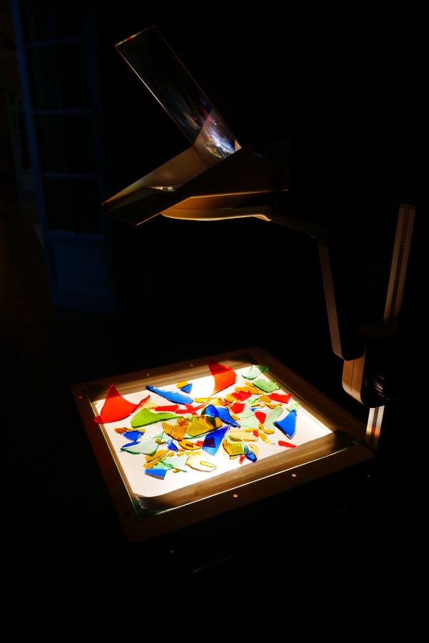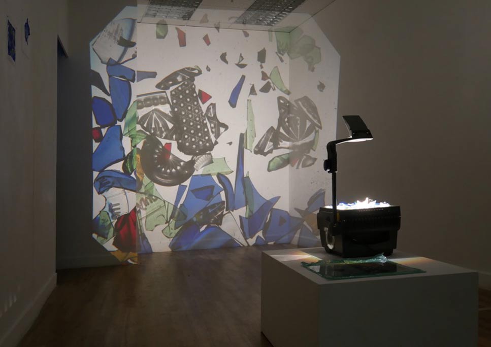 Rétro-projecteur et verre cassé lors de l’exposition avec Sophie Sefraoui, Let the dust settle, Céline Gallery, Glasgow, Écosse.