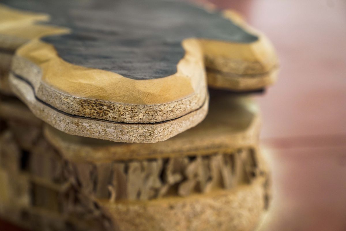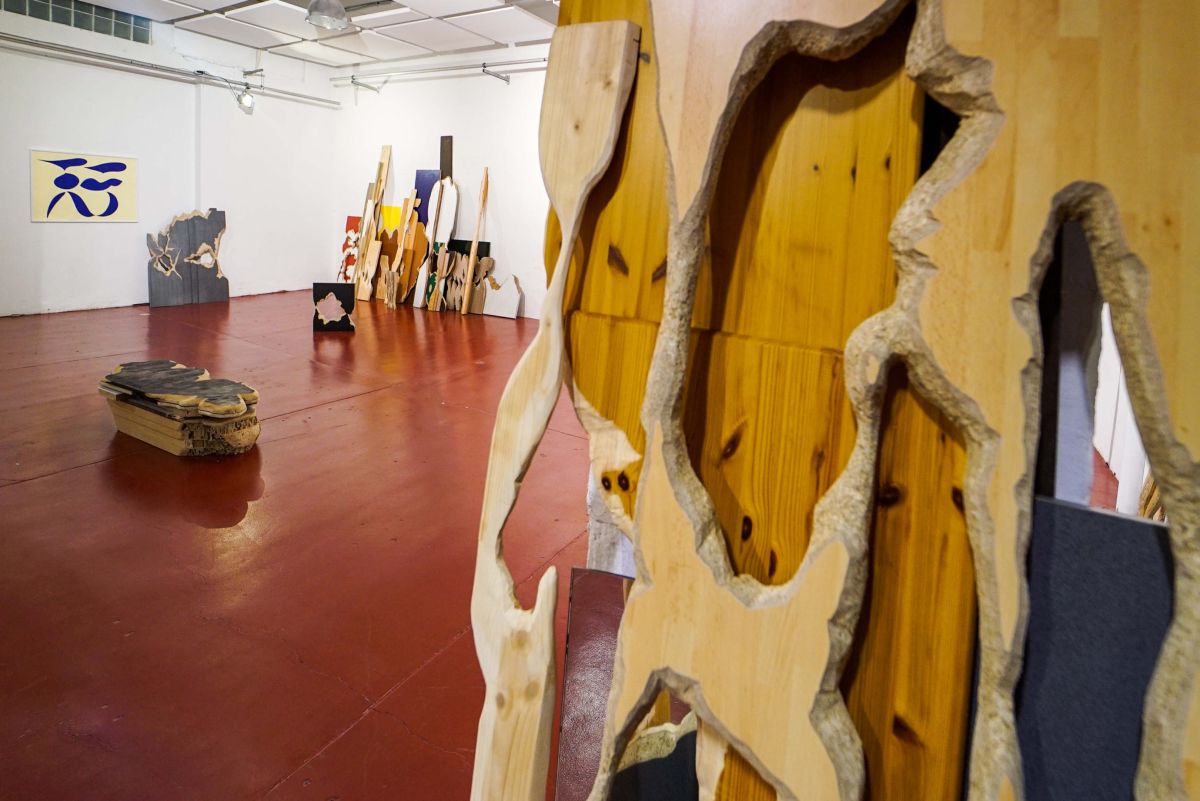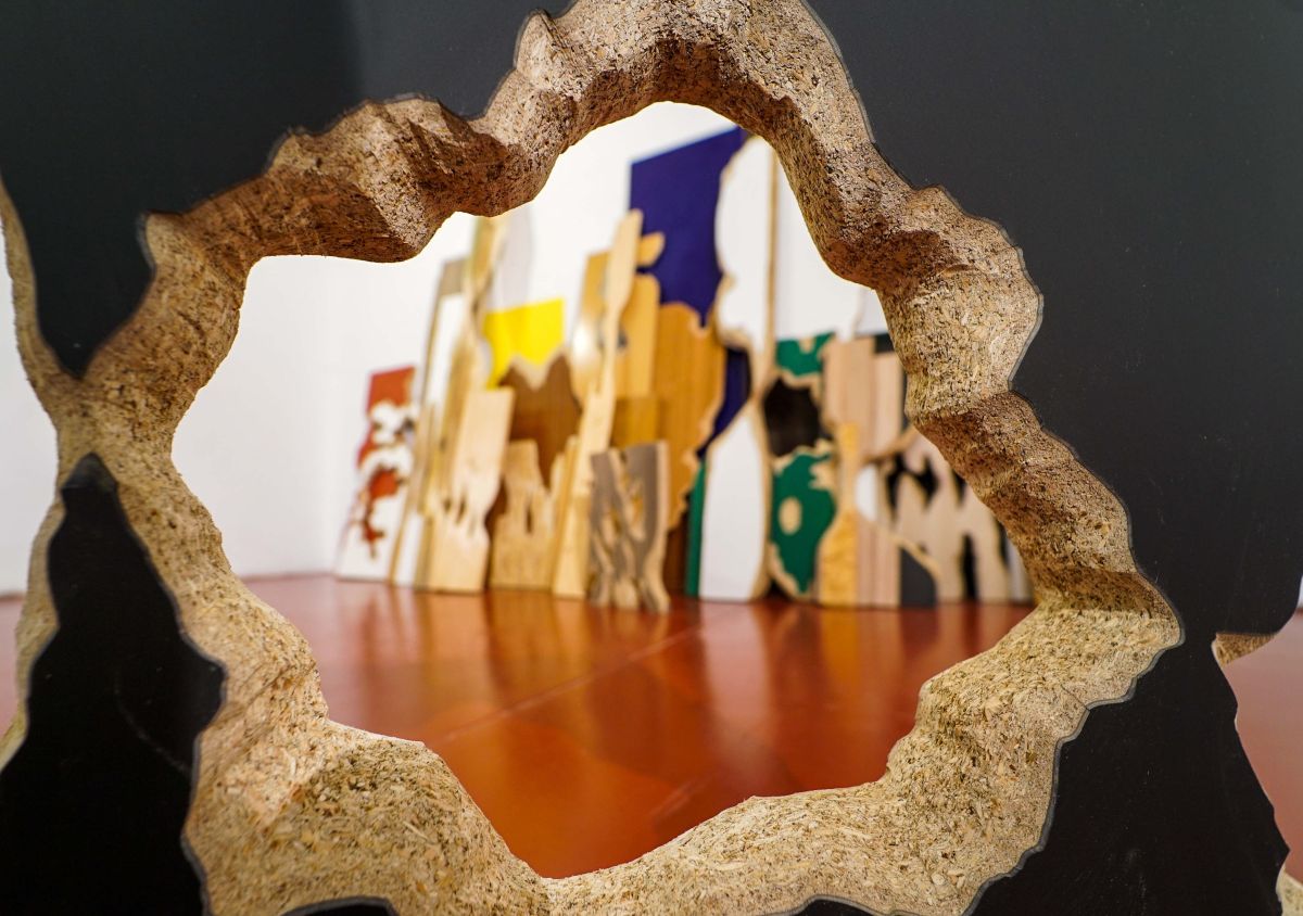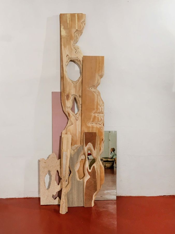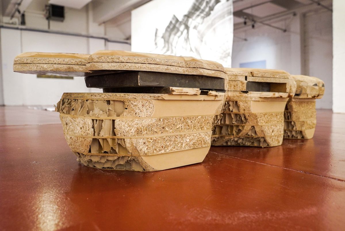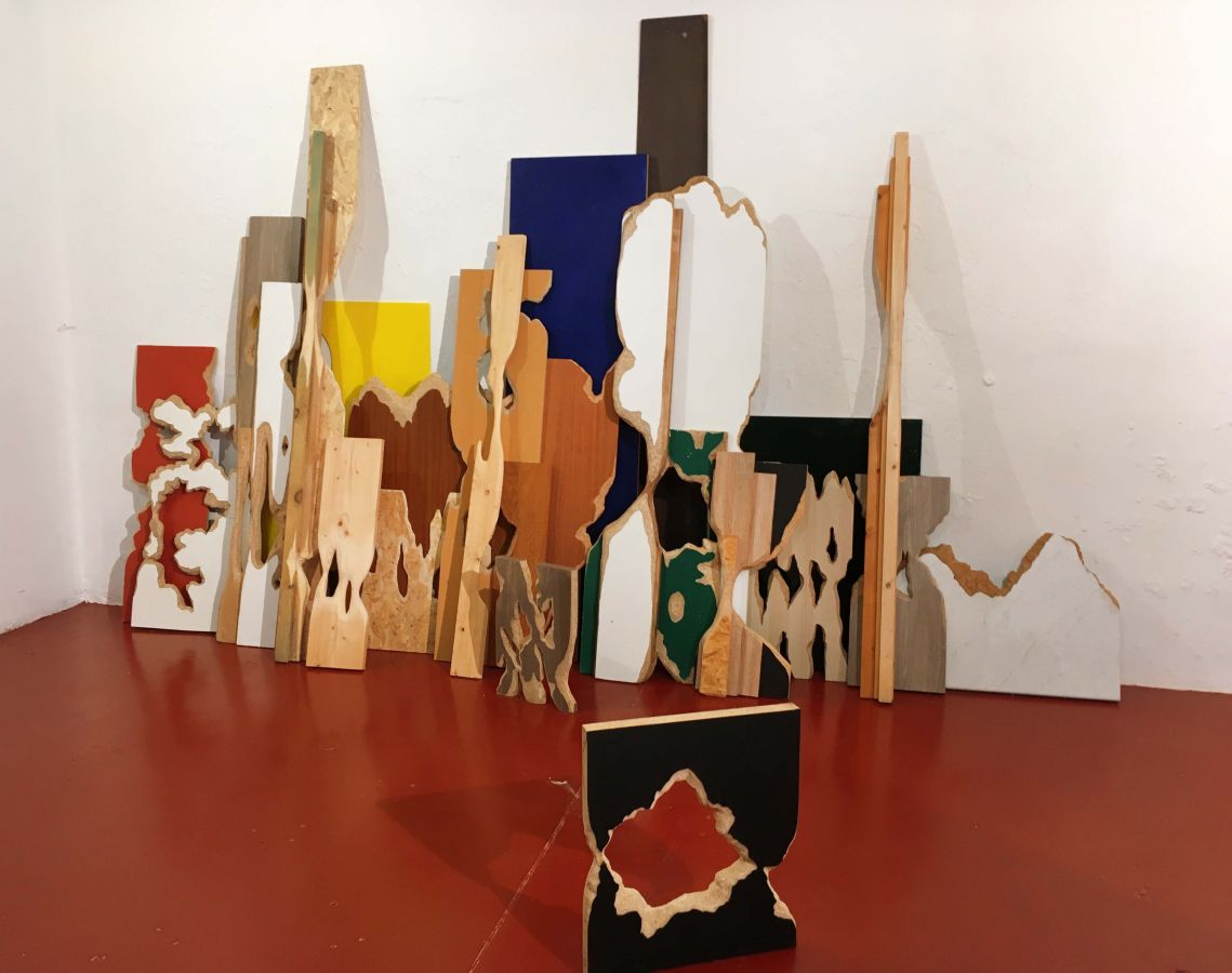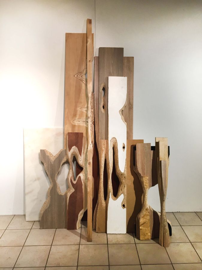 Série de plusieurs modules en planches de laminé et de contre-plaqué collés et sculptées, dimensions et installation variables.