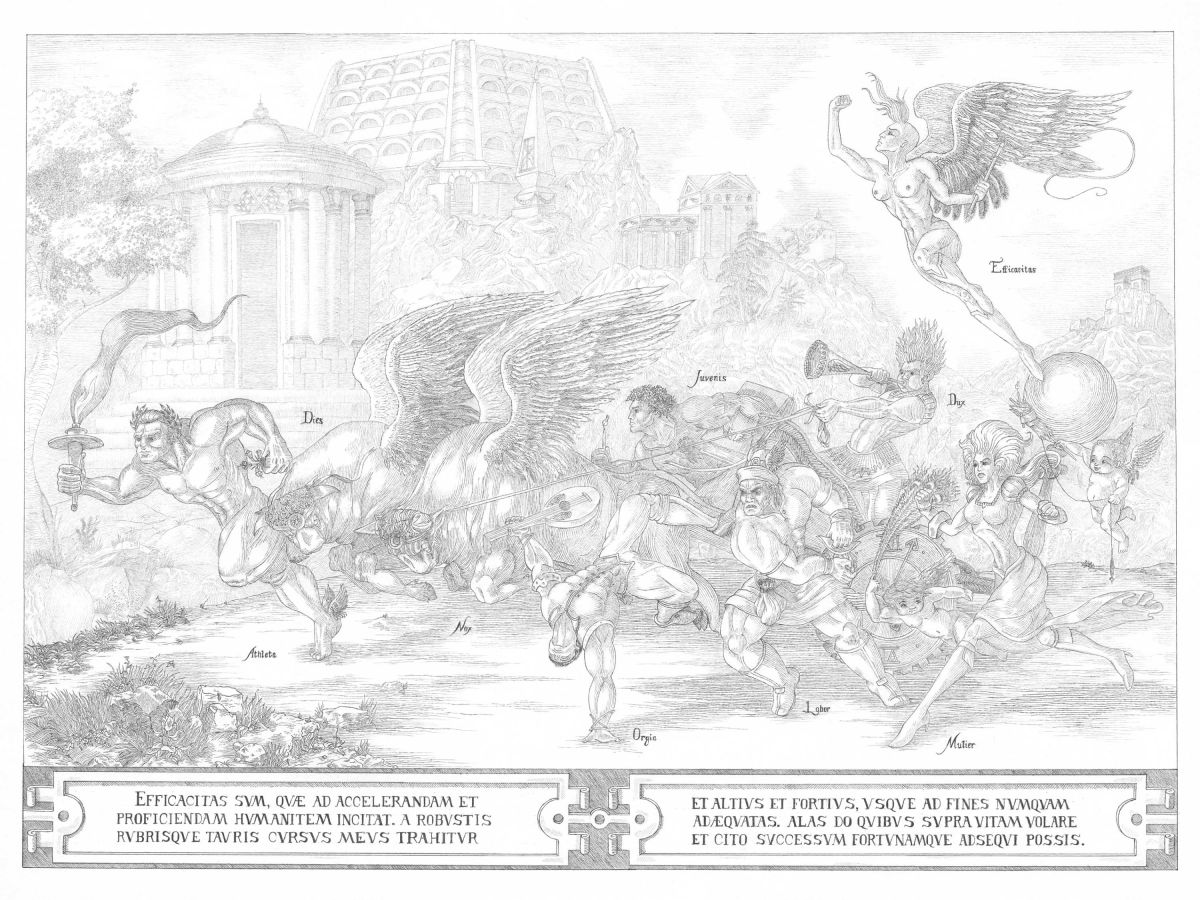 Inspiré de gravures morales de la Renaissance (Le cycle des Vicissitudes humaines de Maarten Van Heemskerck), ce dessin propose d’ériger l’efficacité en valeur cardinale de notre époque. Cependant, loin de la culture Humaniste qui inspire le motif, l’allégorie est ici tirée d’une publicité de boisson énergisante qui décrit en six portraits archétypaux l’Homme contemporain hyperactif.