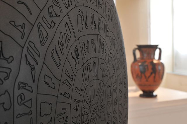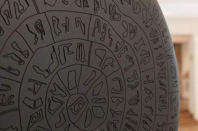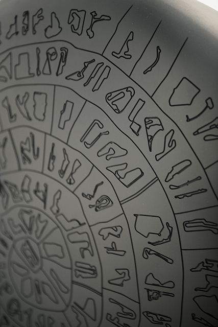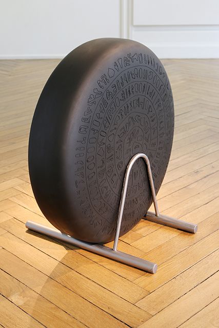 À mi-chemin entre un vestige archéologique et une roue de voiture, cet objet emprunte pêle-mêle à l’alphabet des runes, à la Pierre de Rosette et au disque de Phaistos. À ces références, se voient greffée une réalité très étrangère : les plans synthétiques des circuits de Formule 1, classés par ordre de pays et par ordre de continent.