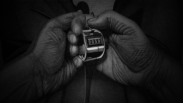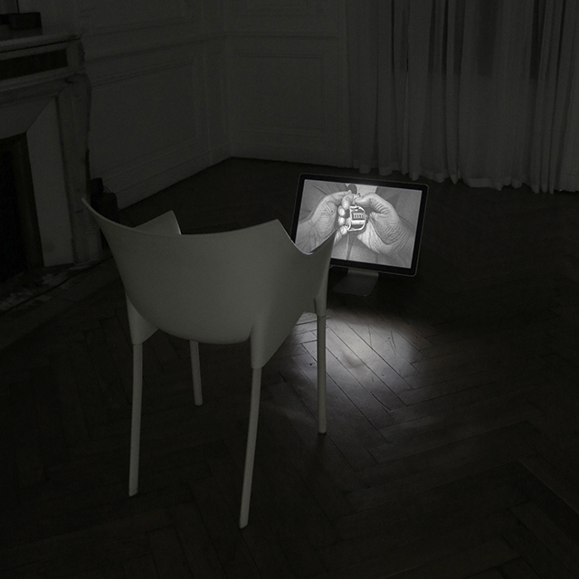 Dans une pièce exiguë plongée dans le noir, résonne le tic-tac de la vidéo Fainéant. Ici le travail prend du temps, visualise le temps et remplit le temps. La distinction entre travail aliéné et travail libérateur se perd dans ce geste infini qui nous renvoie à la fois au labeur rationalisé et aux activités ascétiques. Dans cet espace feutré, cette courte animation semble transformer ce compteur en chapelet d’un culte contemporain du dieu Chronos.