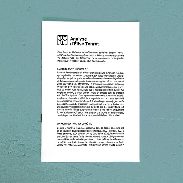 À l’automne 2019, des groupes de réflexion se sont constitués autour de la notion de mérite. L’objectif de ces rencontres est la rédaction de mesures permettant de construire une cité méritocratique idéale. Malgré leur présentation formelle - proche d’une communication émanant d’un think-tank - ces propositions se contredisent et loin de constituer un programme politique cohérent, amènent à appréhender la complexité de cette idée de méritocratie.