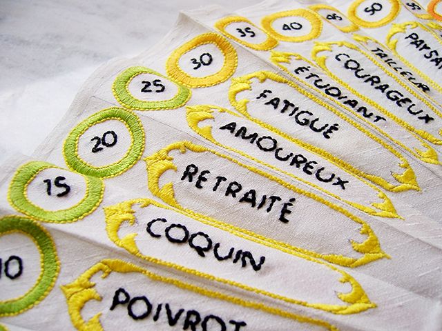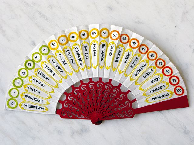 Speed Dating est un éventail orné d’une échelle d’évaluation de la puissance masculine. Le motif brodé a pour origine une machine de foire servant à mesurer la force physique. Un outil de séduction féminin et la compétition virile fusionnent ici en un seul et même objet.