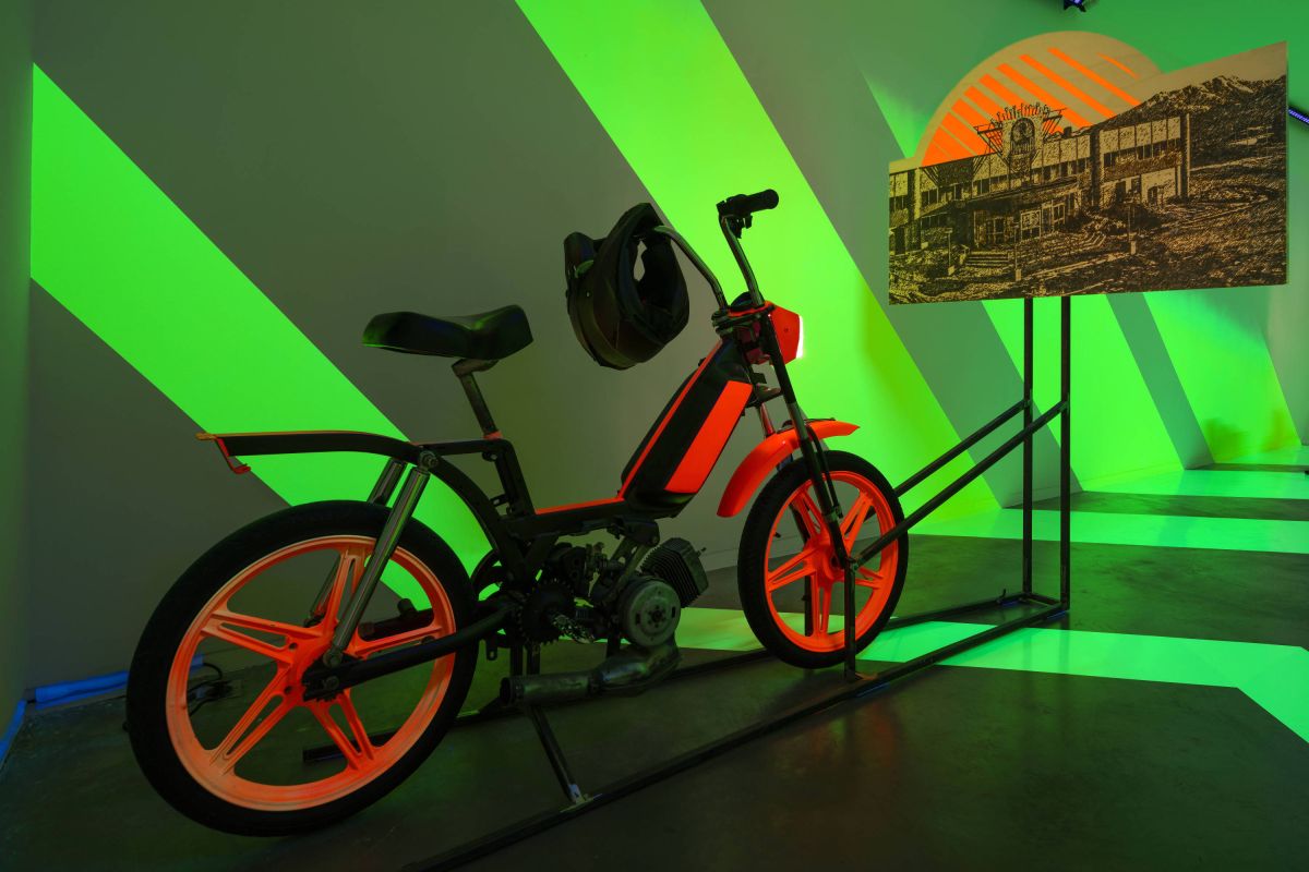 Pyrogravure et acrylique sur bois latté peuplier, mobylette avec casque et audio intégré.