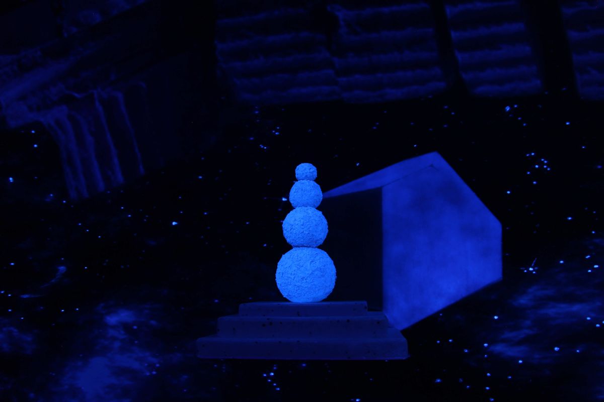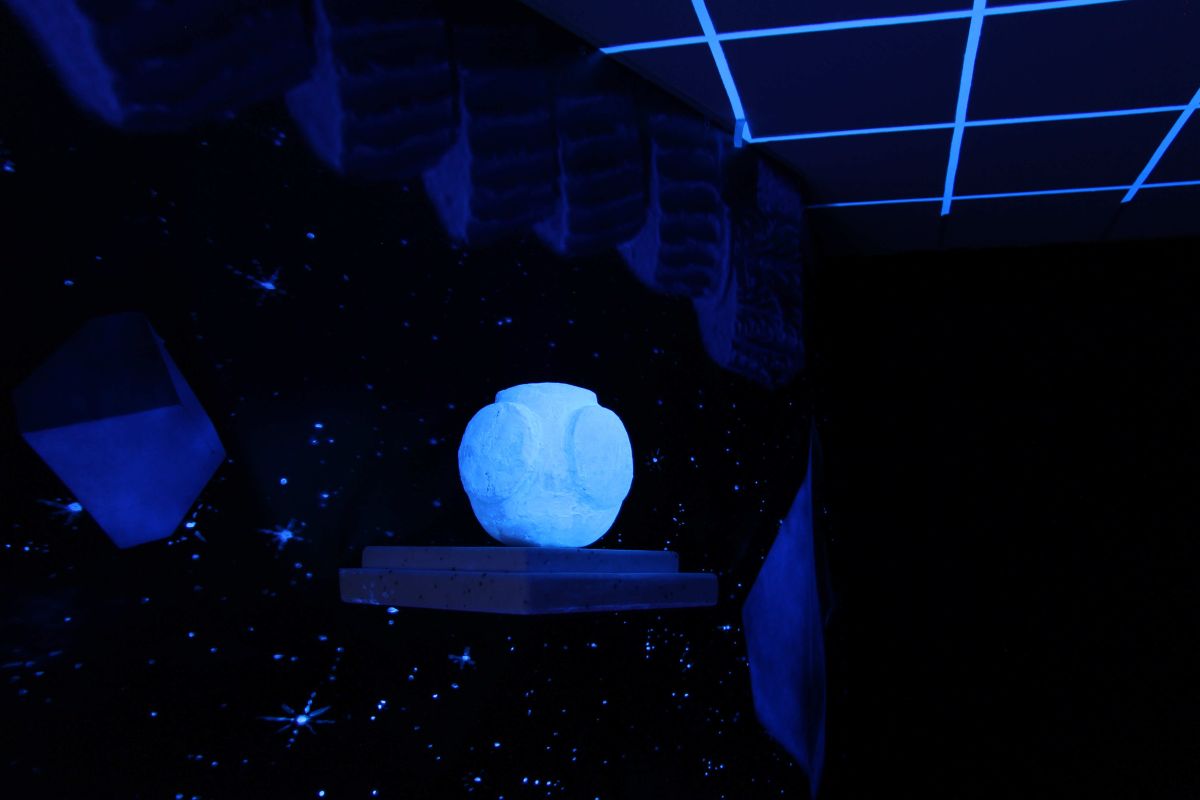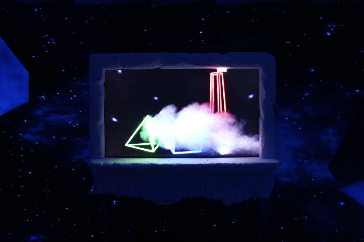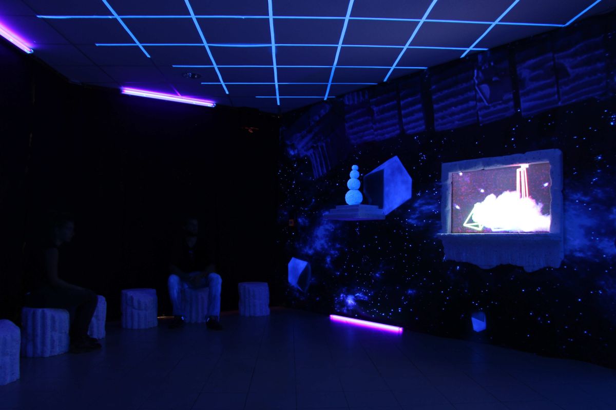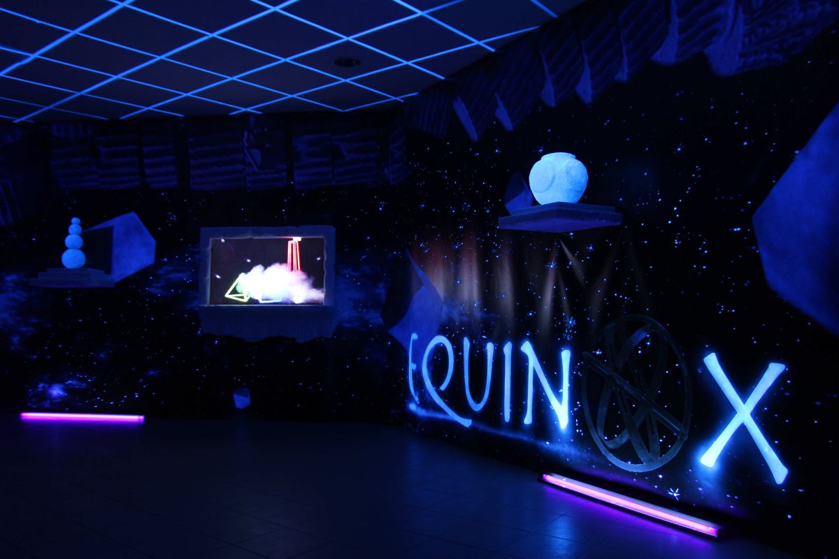 Tony Regazzoni est reçu à Fiac par une famille récemment installée au village et qui vient de rouvrir le café multiservice. Greg, heureux tenancier de ce commerce de proximité, a une solide expérience de la nuit : il fut videur puis organisateur de soirées à Paris et en Île-de-France. Très vite esquissé, le projet de Tony ravit Greg, ça se passe au comptoir du bistrot où il est question de lumière noire et de cocktails fluorescents. C’est la verrière faisant office d’entrée du lieu qui est occultée et transformée en une installation faite d’impressions sur bâches, de sculptures aux formes minimales et aux évocations ambigües, de tabourets reproduisant des colonnes gréco romaines, le tout réagissant à la lumière noire - un concentré de clubbing années 80/90 organisé autour d’un écran plat qui diffuse en boucle le film « Célébration (Petty Dancing) », réalisé par l’artiste cinq ans avant et dont il dit : « Mon appréhension du queer s’est développée grâce à une « famille » que j’ai rencontrée à mon arrivée à Paris il y a 10 ans. J’ai connu et appris ce qu’était le queer non pas à travers des livres mais à travers la fête et les rencontres du week-end. À l’époque, il n’y avait pas encore cet engouement qu’on retrouve aujourd’hui pour cette terminologie de « queer ». Paris n’était pas vraiment une fête, les moments de rassemblements festifs se faisaient rares. Un seul bar et un seul club nous réunissaient chaque week-end, quels que soient notre « genre », notre couleur ou notre sexualité. La fête nous permettait de célébrer nos différences sans le moindre clivage. Tous nous étions beaux dans notre représentation et notre appétit de célébration. C’est donc ce qui m’a porté en réalisant ce film. Rendre hommage à cette beauté qui frôle l’universel, en réunissant une grande partie des protagonistes de cette famille recomposée qui s’est épanouie dans ce mouvement queer et l’a rendu palpable et excitant. » De jeunes gens dansent sur Ocean song de The Miracles Club dans un espace matérialisé par des formes géométriques abstraites faites de matière fluorescente ou de traits de lumière captés par de la fumée. La musique est électronique et les danseurs très éthérés. Equinox est le nom de la boîte de nuit où nous nous trouvons et qui n’en est pas une. C’est juste une image en deux ou trois dimensions dans laquelle nous prenons place pour y participer en adoptant la posture inhérente au dispositif des night clubs où la piste de danse concentre tous les regards périphériques. La géométrie semble tout régler dans la conception de cette œuvre, les mots, les formes, les images et l’organisation de l’ensemble. Ainsi, un équinoxe est un instant de l’année où le soleil traverse le plan équatorial terrestre, mais c’est aussi un des deux points d’intersection de la ligne des équinoxes avec la sphère terrestre. Ces géométries semblent cependant s’apparenter d’avantage au symbolique qu’au formel et l’on se sent parfois dans la peau d’un archéologue à la recherche de sens devant un monument mégalithique de type Stonehenge. Quel est donc le culte auquel nous assistons ? Il y a bien sûr une célébration par le rassemblement périodique d’une communauté qui veut renforcer sa cohésion, ici par la danse, la musique, le culte de la fête, du plaisir et des différences, une sorte de dithyrambe, cet hymne religieux de la Grèce antique, chanté par un chœur d’hommes et accompagné d’une danse représentant l’emprise de Dionysos sur les hommes.