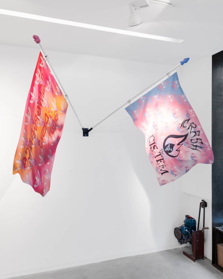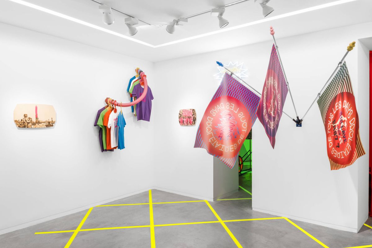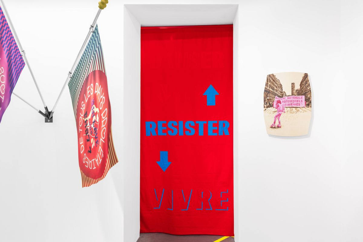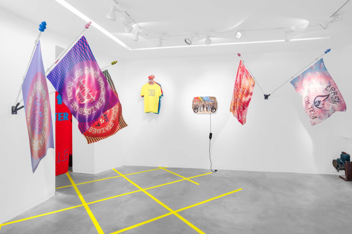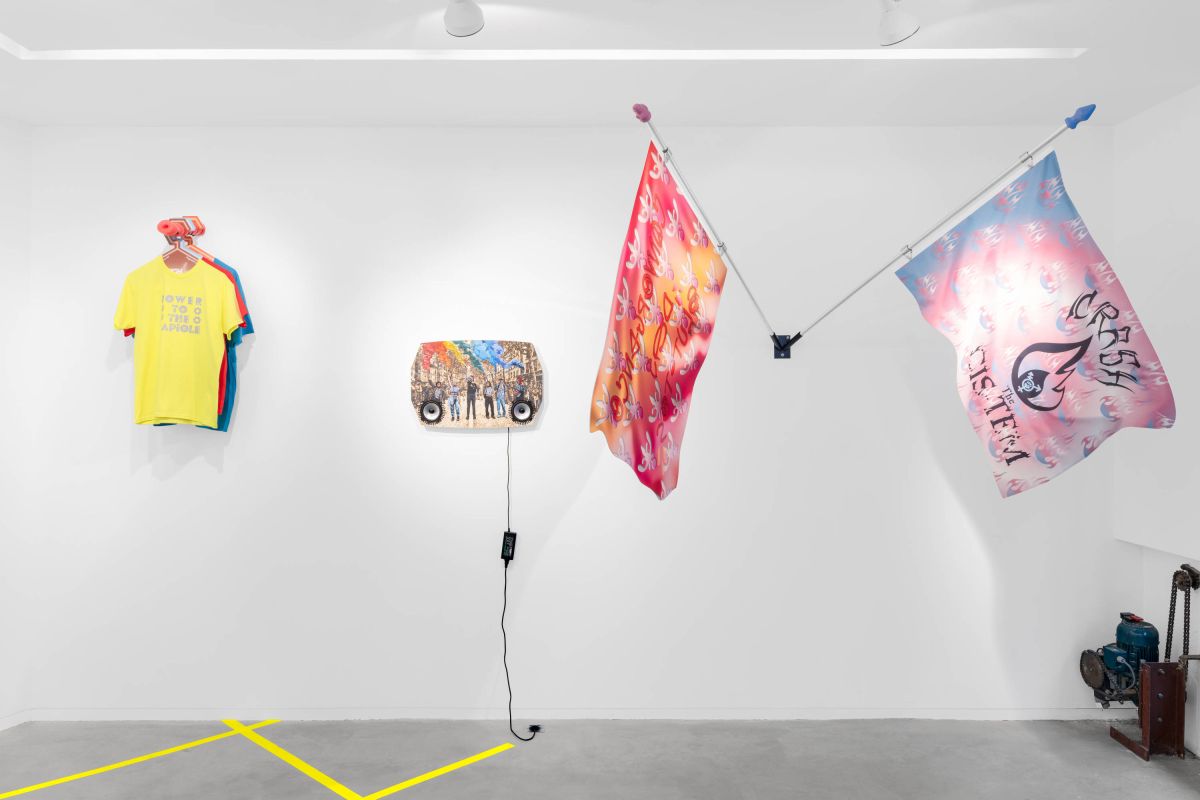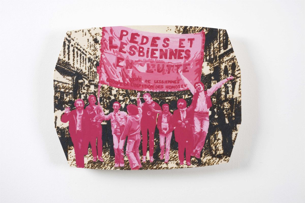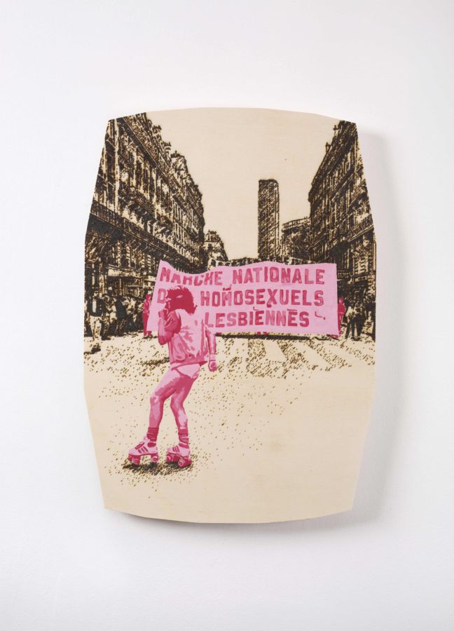 Disposée le long de trois salles, l’exposition HIGH ENERGIES s’ouvre par le musée des slogans. Une collection de drapeaux, en hommage au rainbow-flag conçu en 1978 suite à l’assassinat d’Harvey Milk (premier élu américain ouvertement homosexuel) se voit compléter d’une explosion de slogans de manifs issues du passé comme contemporaines. En déclinant, en collaboration avec H·Alix Sanyas, en écharpes, t-shirt, crop-top, etc. des slogans comme “Prolétaires de tous les pays, caressez-vous” du FHAR, association LGBTQI+ mythique des 70’s, au “Prolétaires de tous les pays, invertissez-vous“ du jeune collectif radical les Inverti·e·s, HIGH ENERGIES rappelle avec acuité que l’humour, cinglant comme un coup de poing, fut toujours une arme de choix pour les minorité·e·s. Comme la colère et l’hédonisme, retranscrits ici par une série de tableaux peints et pyrogravés reprenant des images d’happening, manifestations, zap, action-prop, qui ont marqué par leur symbolique l’histoire queer. Une ébullition amplifiée par le marquage de bandes jaunes courant du sol aux murs, en clin d’œil au graphisme des pochettes de Hi-NRG autant qu’à celui des flacons de poppers, ainsi que la diffusion sonore du podcast “Le Feuilleton des luttes” créé par le Centre d’Archives LGBTQI+ Paris, avec la réalisation d’un nouvel épisode consacré aux Inverti·e·s.