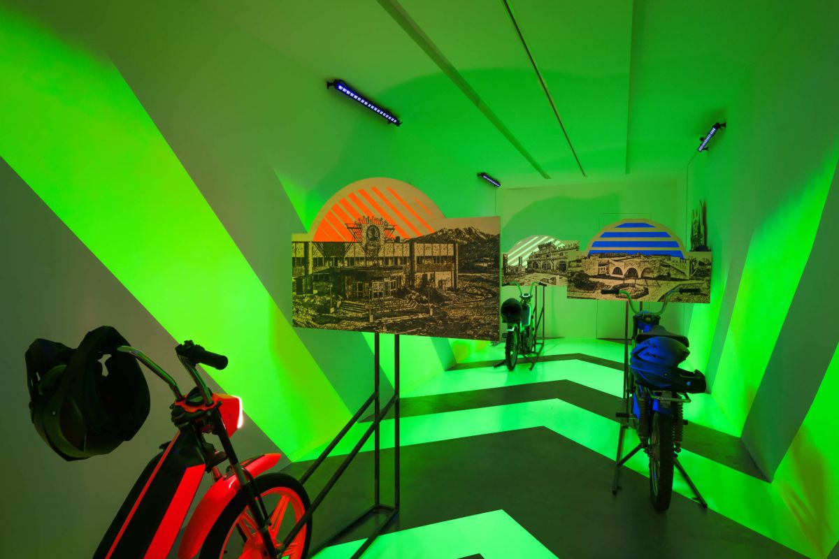 Bande Organisée, la dernière partie de l’exposition, adaptation d’une installation réalisée au Nouveau Printemps de Toulouse l’année dernière, évoque le voyage initiatique entrepris par Tony, parti sur la piste des discothèques italiennes de l’âge d’or des 1970, dont la plupart sont désormais abandonnées dans leurs ruines. Saisies dans leur architecture fantasque, et transformées en pyrogravures, l’hommage à ces temples rétrofuturistes est porté par des mobylettes tunées et rutilantes, dont le phare éclaire les compositions. Une manière pour le public, juché sur la selle, de s’immerger dans ces fièvres du samedi soir, tout en se laissant porter par des récits librement imaginés par de jeunes artistes queer radicaux·ales comme Camille Desombre, Naëlle Dariya, Gorge Bataille ou Aurélie Faure.