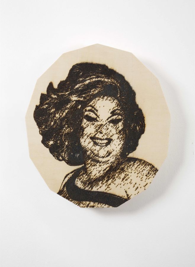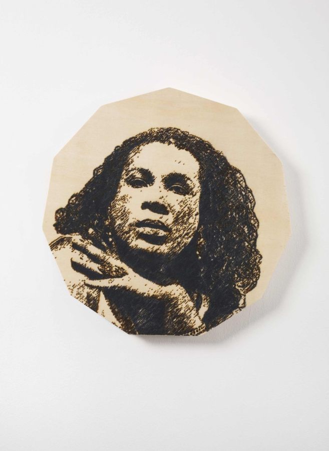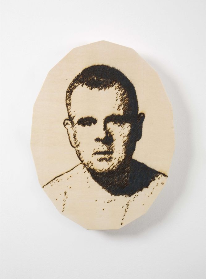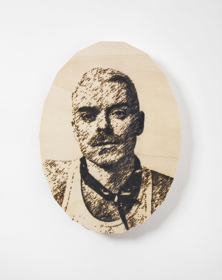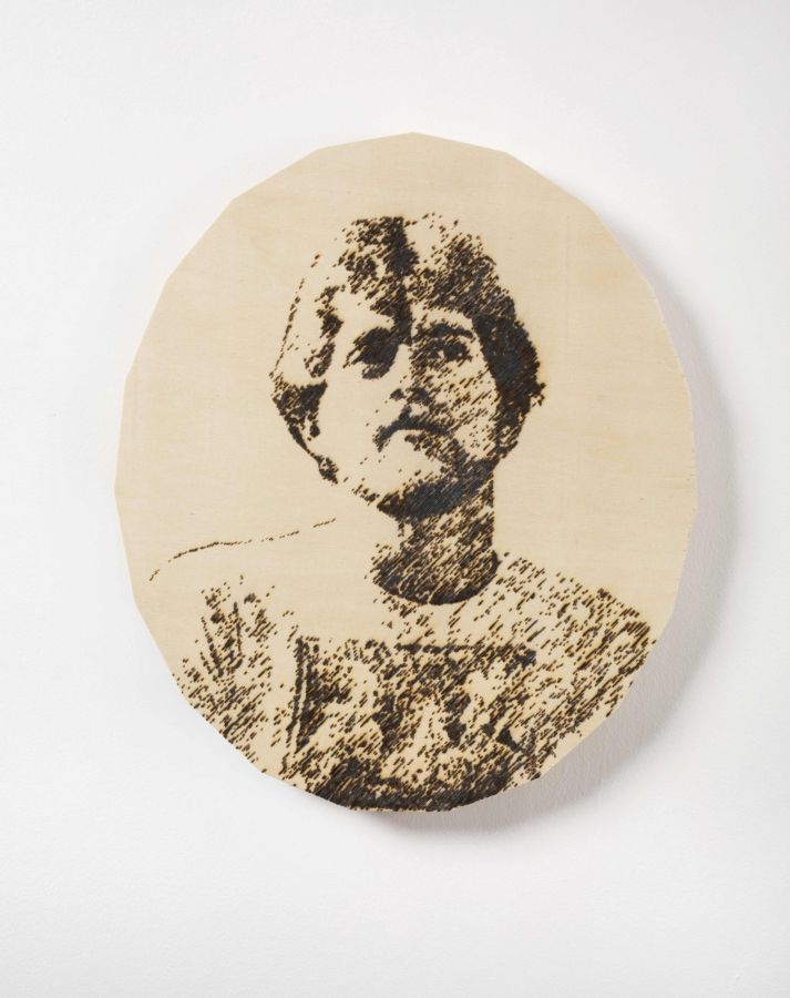 Pyrogravure et acrylique sur bois latté peuplier. D’après une photo de Dominique Couvreur, 1979.