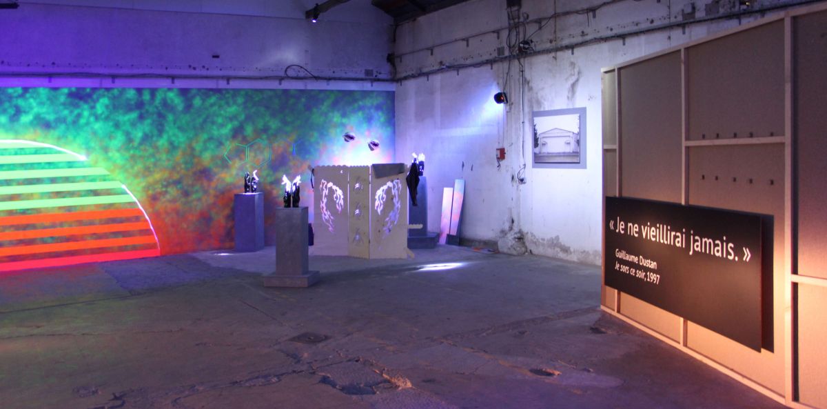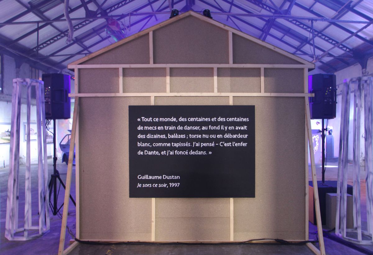 […] Partageant un référentiel temporel identique – les années 90 – ainsi qu’un même milieu – gay, noceur et militant –, ils sont séparés par un contexte territorial opposé : la vie nocturne à Paris pour Guillaume Dustan, les boîtes de bord de départementales jurassiennes pour Tony Regazzoni. Cet antagonisme est mis au travail dans l’exposition, l’artiste intégrant le travail de l’écrivain en vue