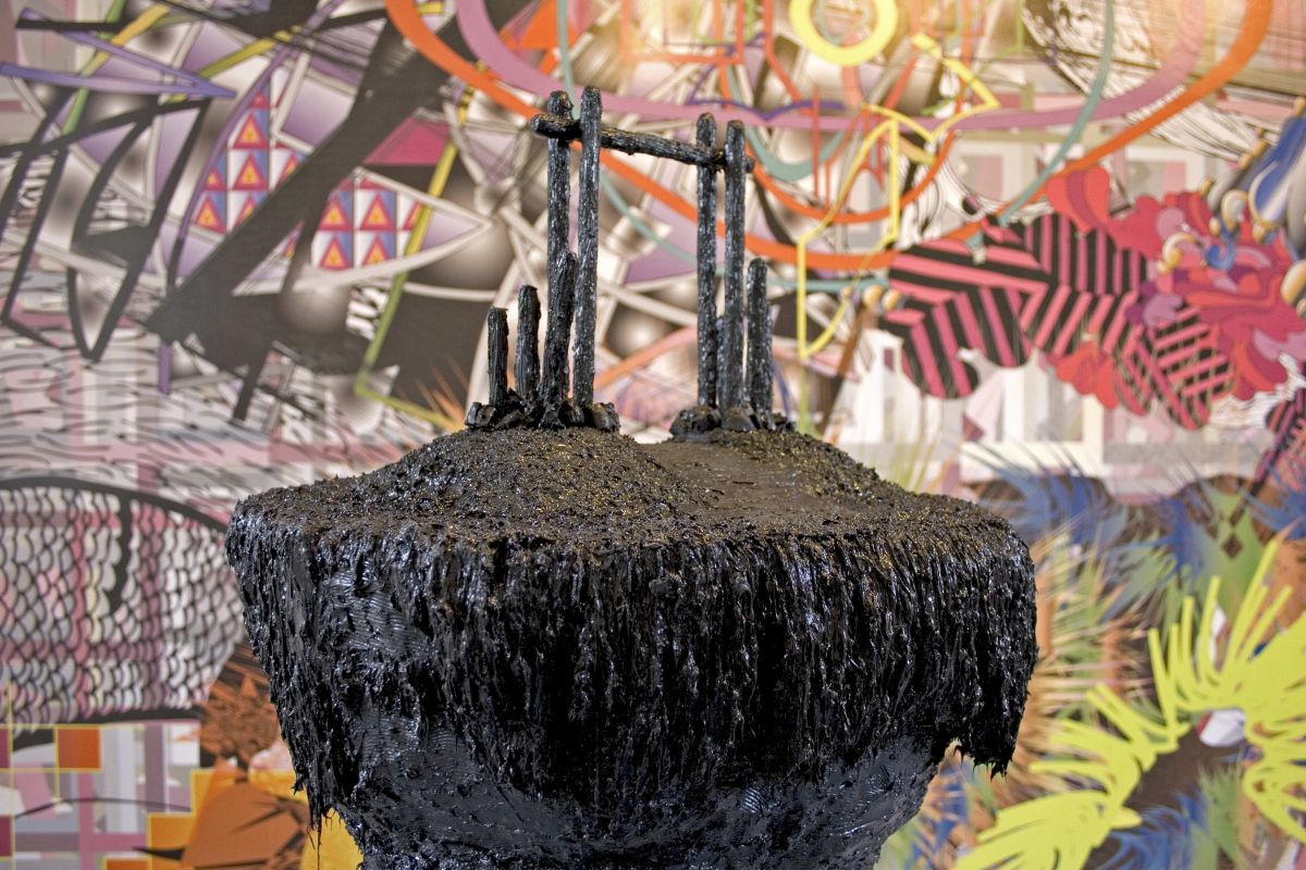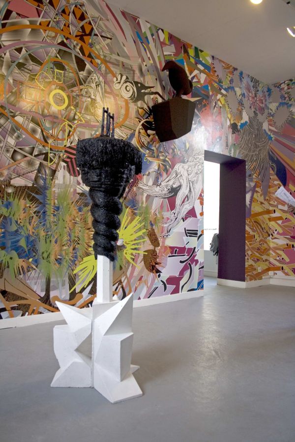 Le principe même du décoratif, fait pour être perçu et non pour être vu, est clairement affiché avec les wallpapers de Didier Rittener et d’assume vivid astro focus (avaf), afin d’encourager une mise en espace englobante, proche de la salle de musée moderne (et sa couleur pourpre, invention contemporaine complémentaire du white cube). Cette dialectique instaure une réflexion sur la mise en exposition, comme possibilité essentielle de faire sens par l’image. Le concept de photogénie de l’exposition, comme l’explique Eric Troncy, où chaque salle fait image, rappelle l’importance d’un langage visuel autonome, qui permet de renouveler la réception des œuvres. Cette dimension manque cruellement au paysage actuel des expositions, qui se contentent souvent d’afficher la solitude de la « pièce », par peur d’ingérence avec le contenu ou simplement par frilosité du commissaire. Il semble que Troisième Type amorce là un retour aux préceptes du commissariat très affirmé ayant évolué dans les années 1990 et qui s’occupait de renouveler profondément non le propos de l’exposition, mais son langage visuel. On peut ainsi retrouver cette amorce très sensible dans l’agencement risqué des sièges de Piero Gilardi au sol, de l’oiseau composé de sable de quartz de Vincent Beaurin au mur et de la composition totémique bigarrée de Tony Regazzoni et de Florian Sumi, le tout ‘enveloppé’ par le wallpaper d’avaf. Circulation de sens dans la recréation d’un paysage lunaire, on se prend au jeu de la divagation nocturne, étrange, voire menaçante. On a ce sentiment que l’expérience de l’art n’est pas le résultat déceptif d’un discours plaqué, mais l’extraordinaire révélation d’inventions visuelles (pour ne pas dire formelles, toute idéologie à part), où le récit ne supplée pas, mais accompagne le sens de l’œuvre. En quelque sorte, une exposition faite par un artiste. Cela n’a-t-il d’ailleurs pas été trop difficile de produire une œuvre et d’être le commissaire invité ?
