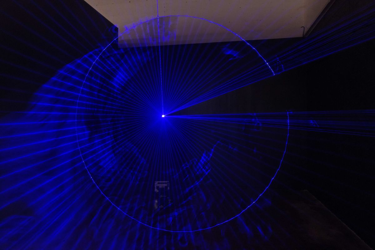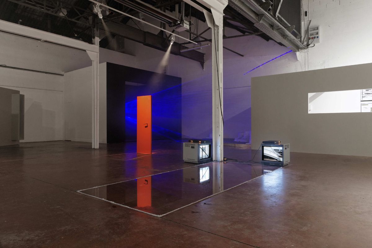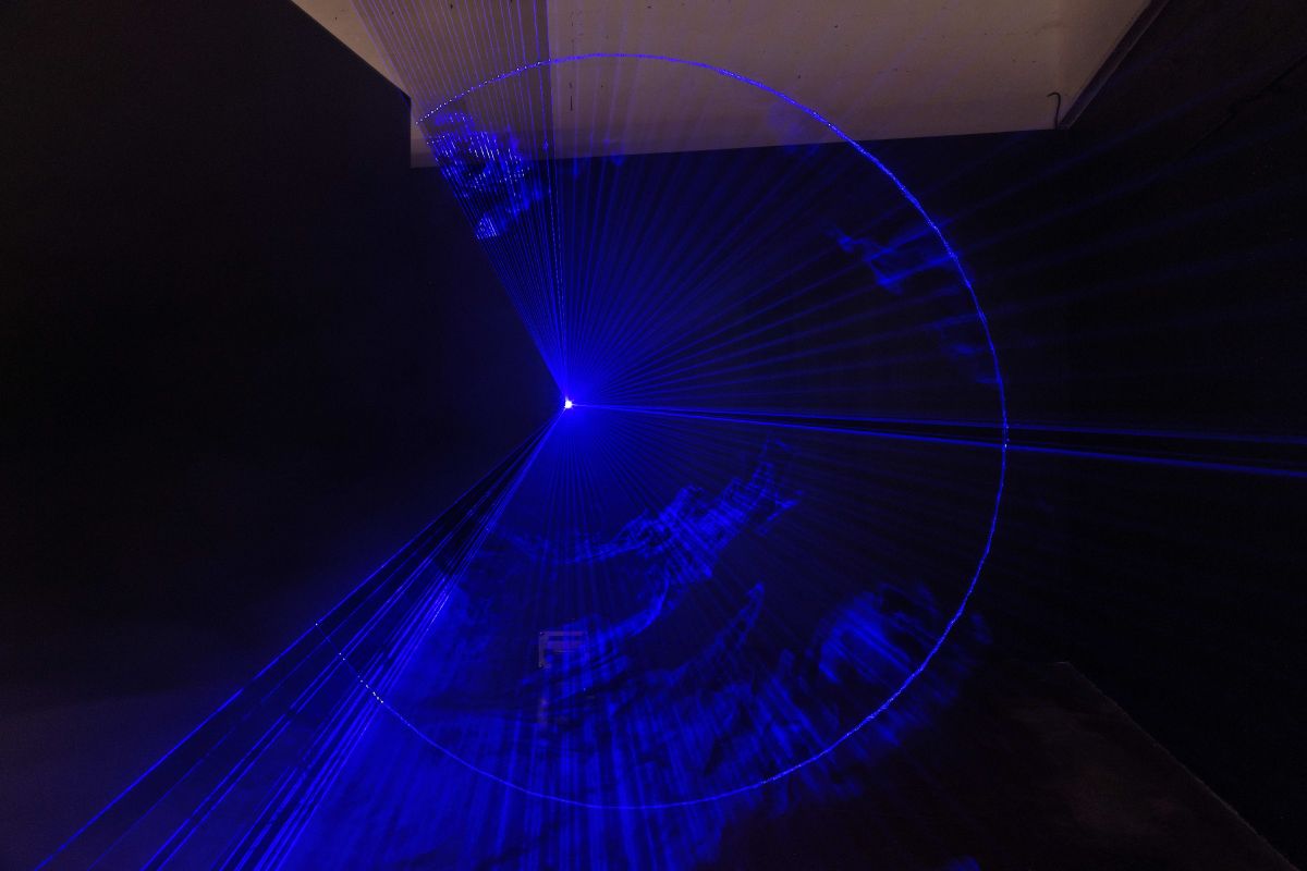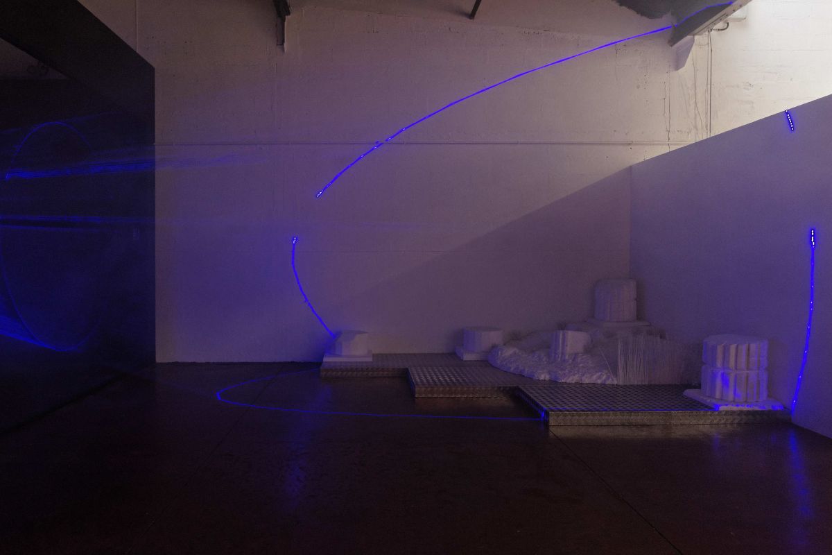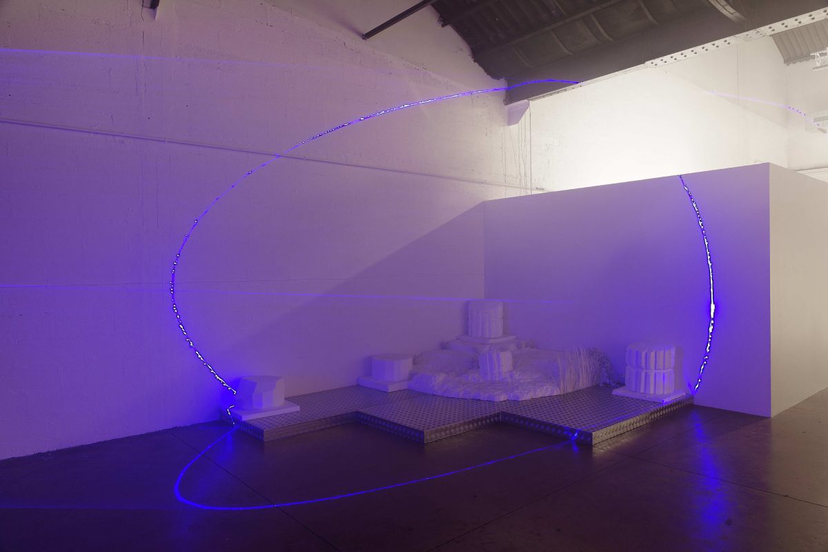 2013Projection laser, écran de tulle, fumigènes, dimensions variablesPlateforme : bois, aluminium, polystyrène, plantes artificielles, 400 x 300 x 100 cmVues de l'exposition collective Bregadoon à la La Tôlerie, Clermont-Ferrand