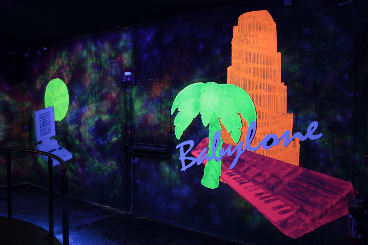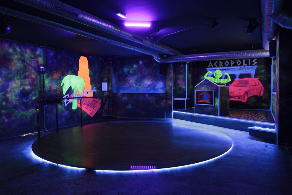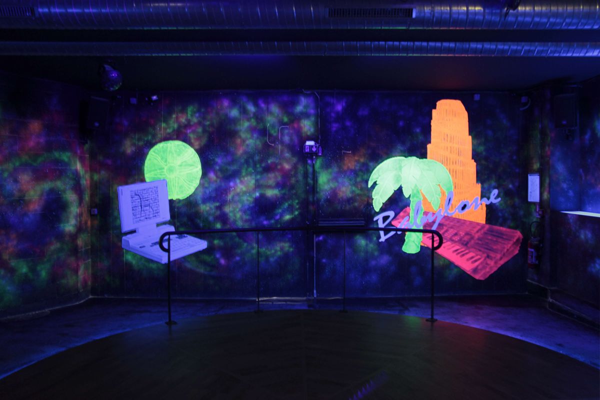 Monde nocturne, célébrations rituelles, phénoménologie des lieux de la fête sont aux racines des Mythologies du dancing, cet ancêtre de la boîte de nuit, objet architectural sans jour et sans fond. Dans la lignée de sa Boîte de nuit présentée en janvier au Studio 13/16 du Centre Pompidou, ce sont les festivaliers que Tony Regazzoni entend faire danser en marge de l’espace défini par la scène musicale et sa fosse. Au vocabulaire de la fête, l’artiste ajoute celui de l’espace et de l’image : images à plat et en creux d’un décor éphémère défini par la musique, la lumière et la transe.