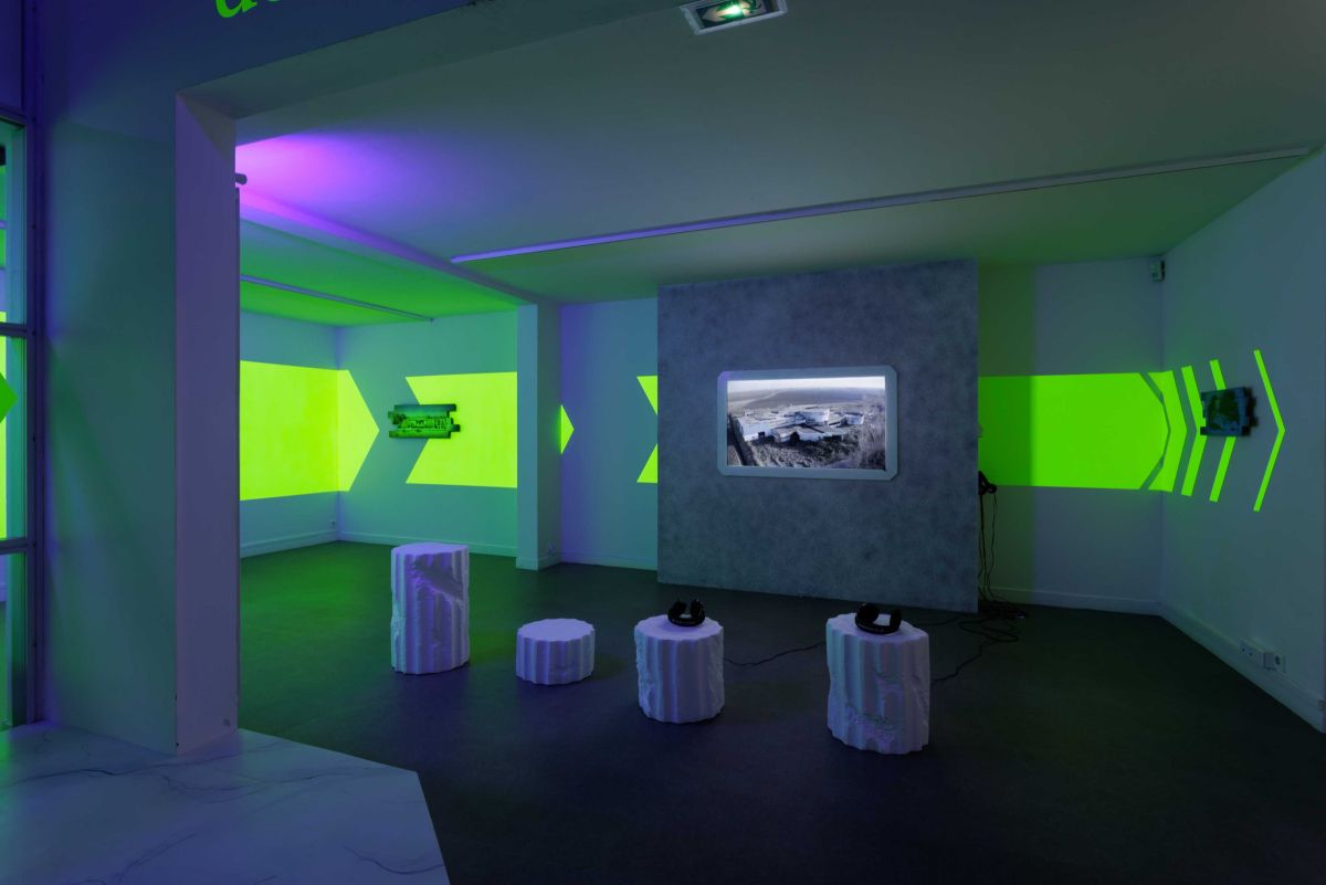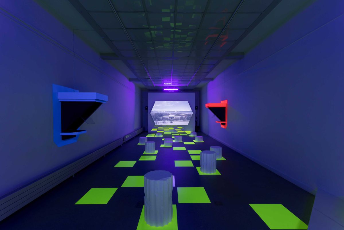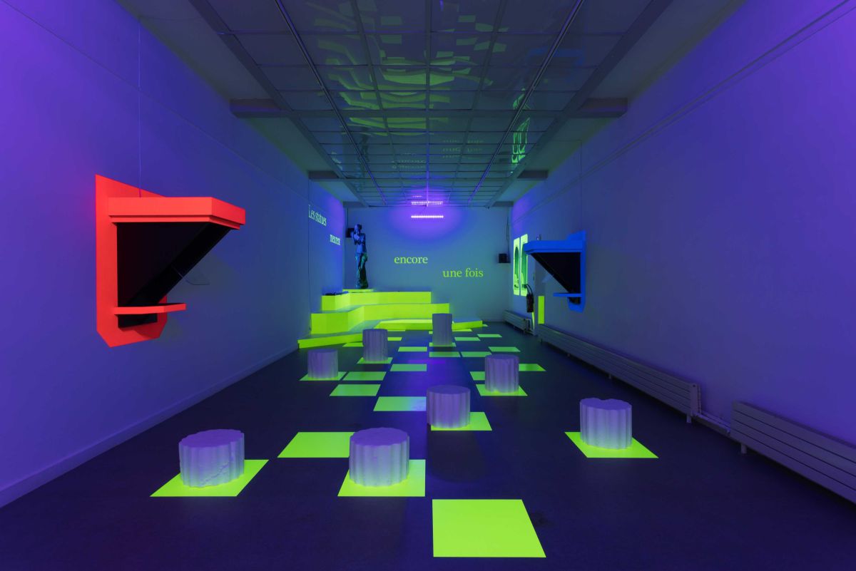 À travers une scénographie immersive, On achève bien les discos offre un corpus d’œuvres fixes ou animées, en deux ou trois dimensions. Produites à partir d’anciennes et de nouvelles technologies, de vestiges et de pastiches, elles sèment le trouble entre archives et fictions. On achève bien les discos retranscrit l’histoire et le souvenir de discothèques italiennes abandonnées avant de plonger le public dans l’atmosphère fluo et fantomatique du célèbre et mythique dancefloor de l’Ultimo Impero. L’exposition se parcourt tel un voyage extatique rythmé par la musique, les corps et les voix de celleux qui l’habitent. Enfin, On achève bien les discos esquisse les premières intentions dramaturgiques du duo et plante le décor de leur futur opéra-vidéo dont l’écriture sera nourrie par une programmation soutenue et pensée avec soin.