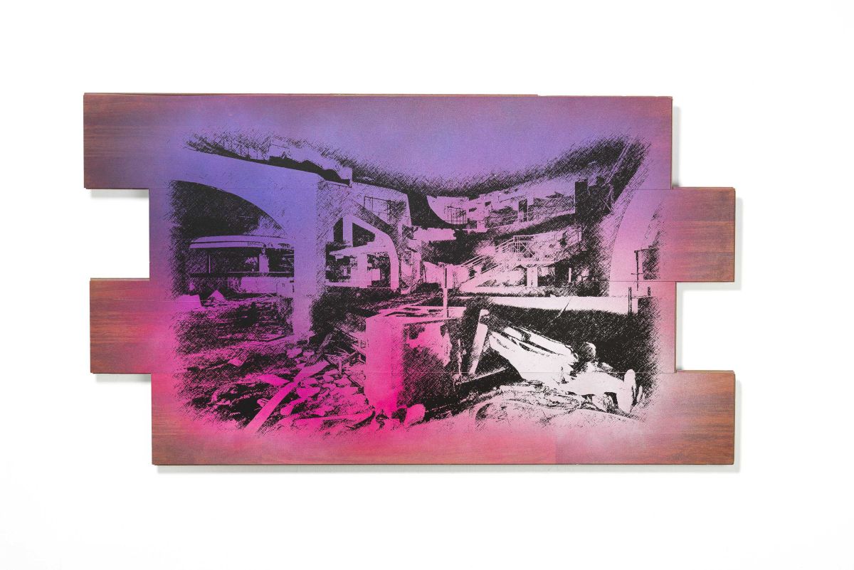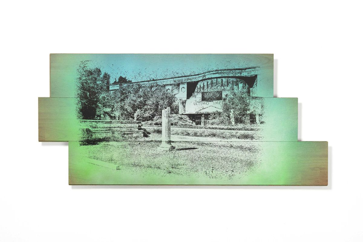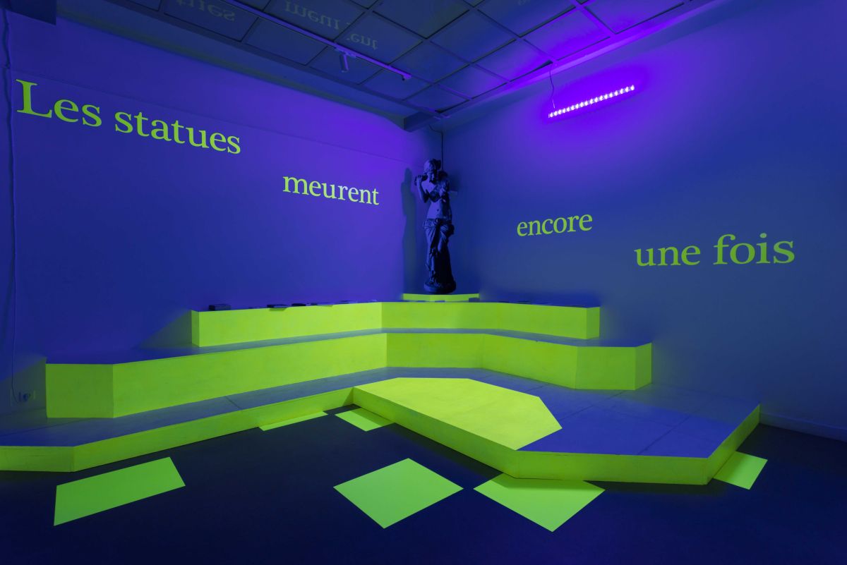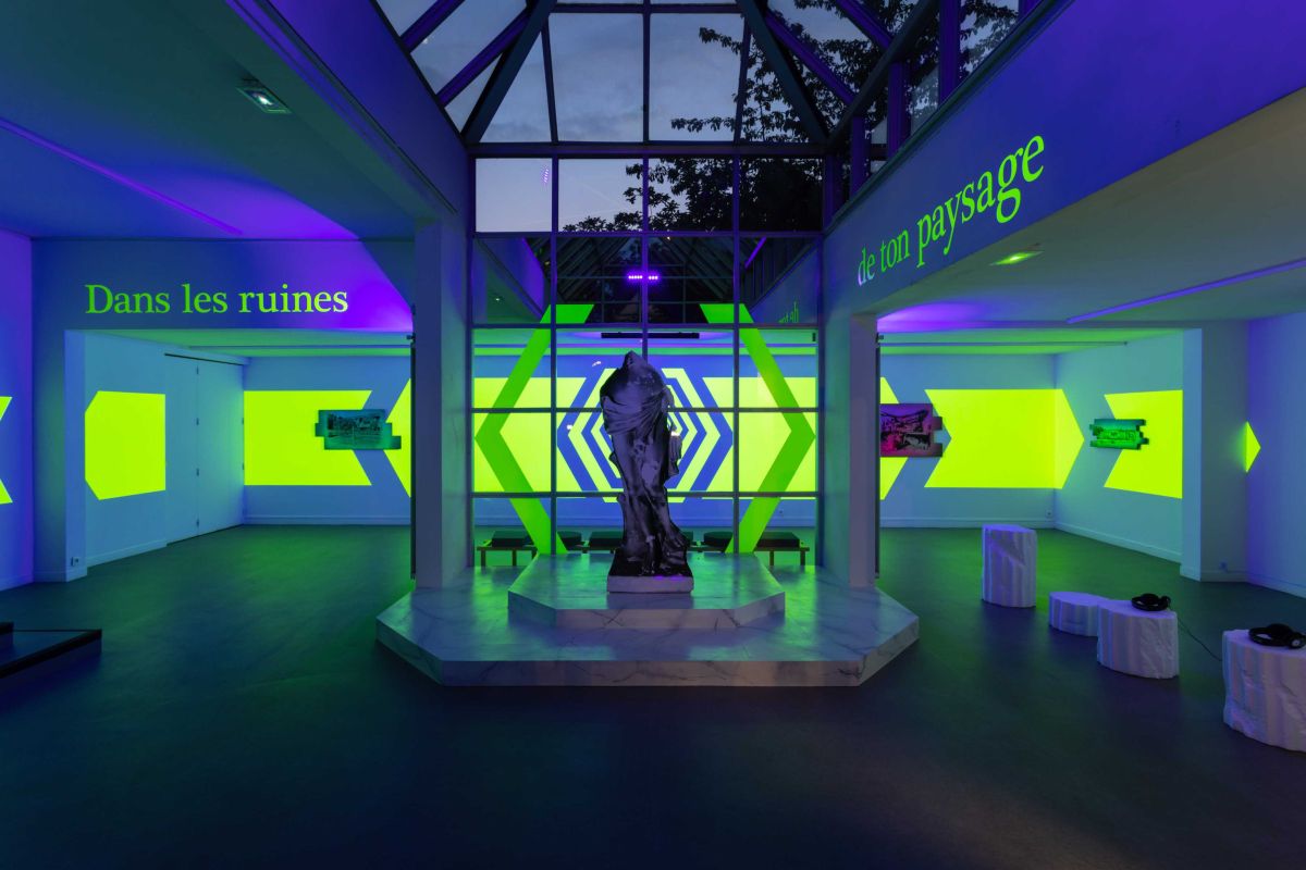 À travers une scénographie immersive, On achève bien les discos offre un corpus d’œuvres fixes ou animées, en deux ou trois dimensions. Produites à partir d’anciennes et de nouvelles technologies, de vestiges et de pastiches, elles sèment le trouble entre archives et fictions. On achève bien les discos retranscrit l’histoire et le souvenir de discothèques italiennes abandonnées avant de plonger le public dans l’atmosphère fluo et fantomatique du célèbre et mythique dancefloor de l’Ultimo Impero. L’exposition se parcourt tel un voyage extatique rythmé par la musique, les corps et les voix de celleux qui l’habitent. Enfin, On achève bien les discos esquisse les premières intentions dramaturgiques du duo et plante le décor de leur futur opéra-vidéo dont l’écriture sera nourrie par une programmation soutenue et pensée avec soin.