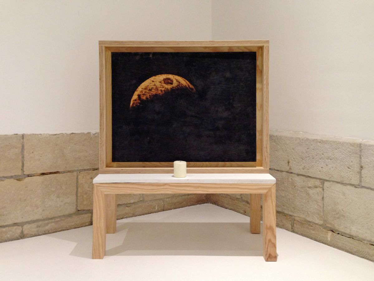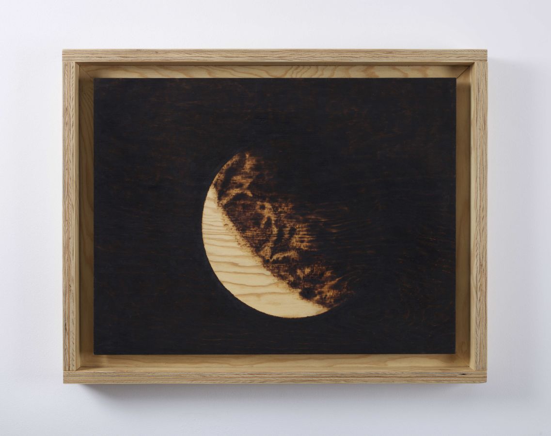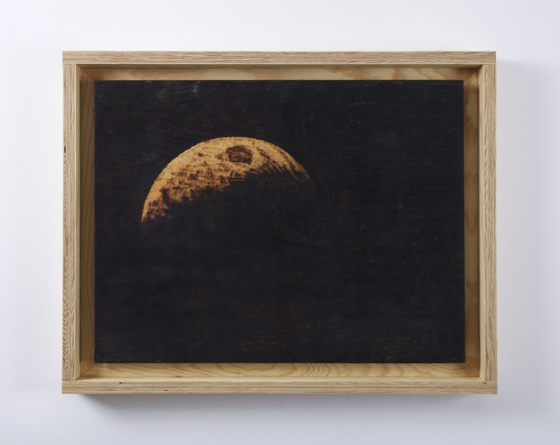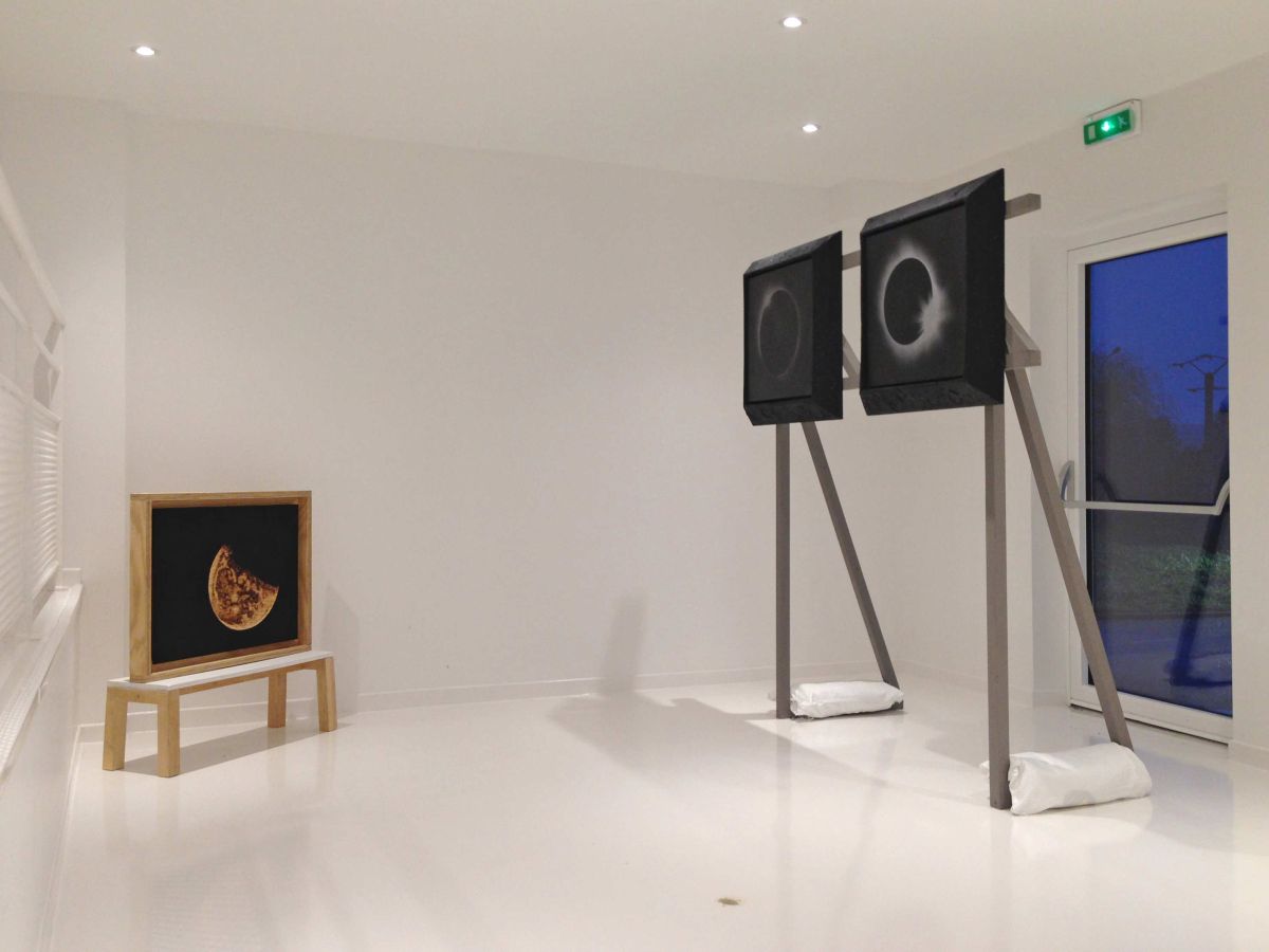 À l’issue de sa résidence à Lindre-Basse, Tony Regazzoni présente sa dernière série d’éclipses, motif qu’il a déjà investi dans plusieurs œuvres récentes. Dans ce principe de nuit artificielle, ce qui l’intéresse c’est précisément le faux-semblant, le paradoxe, mais aussi l’étrangeté du phénomène qui se prête à tous les fantasmes, tout aussi bien ceux des millénaristes en mal de fin du monde, que ceux des scientifiques les plus avertis. L’éclipse c’est aussi un passage, de l’ombre à la lumière, du jour à la nuit, et retour, mais un retour dont on reviendrait légèrement changé, car tous les rites de passage induisent un processus de transformation, des corps ou des esprits. […] Comme dans le black out qui voit soudain les lumières de la ville stopper net, l’éclipse est une pause, un moment d’arrêt susceptible de faire dérailler les machines et d’introduire du désordre dans le calme des apparences. Dans la première série qu’il a réalisée en 2011, Tony Regazzoni utilise une technique qui l’amène à brûler le bois constitutif de ses tableaux. Ce sont les surfaces brûlées qui dessinent le motif laissant en réserve la représentation des parties lumineuses. Dessiner en brûlant, c’est finalement donner corps à une énergie brute, celle de la chaleur qui calcine le bois, celle du soleil qui brûle les rétines, ou peut-être encore celle des corps qui dansent jusqu’à en perdre haleine. Pendant sa résidence, il initie une nouvelle série en expérimentant d’autres matériaux, qui à la nuit tombée, prennent tout leur sens…