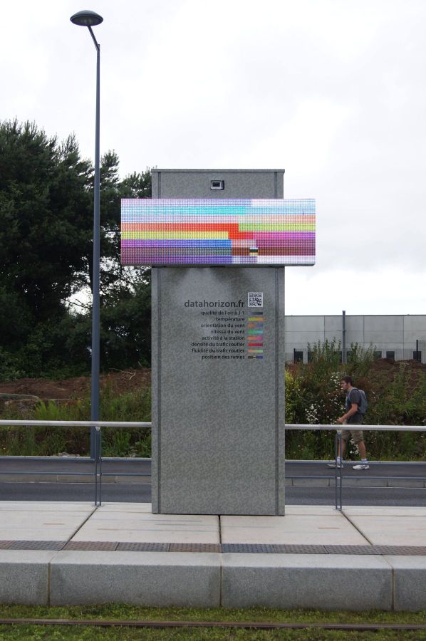 Data Horizon affiche en temps réel une représentation graphique et colorée, créée par des flux de données prélevées via des flux RSS sur internet (qualité de l’air, traffic routier, vitesse du vent, activité à la station…).